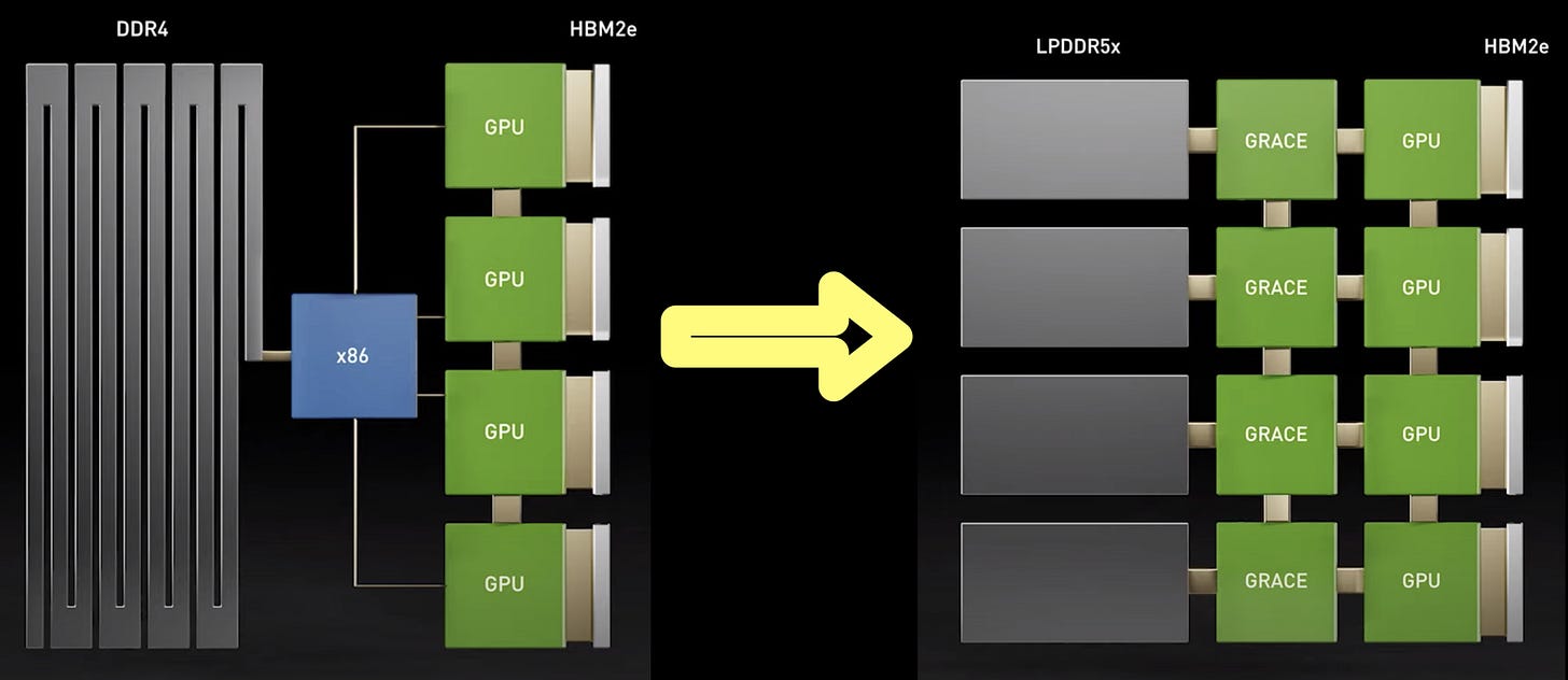 This is largely about removing the memory bottleneck with the more traditional configuration with x86 in between the GPUs and the main system RAM. In other words, the GPUs could exchange data extremely quickly among themselves via NVLinks, but were limited when they had to go to CPU and main RAM. The Grace system connects everything via NVLinks to faster memory with more and wider lanes.