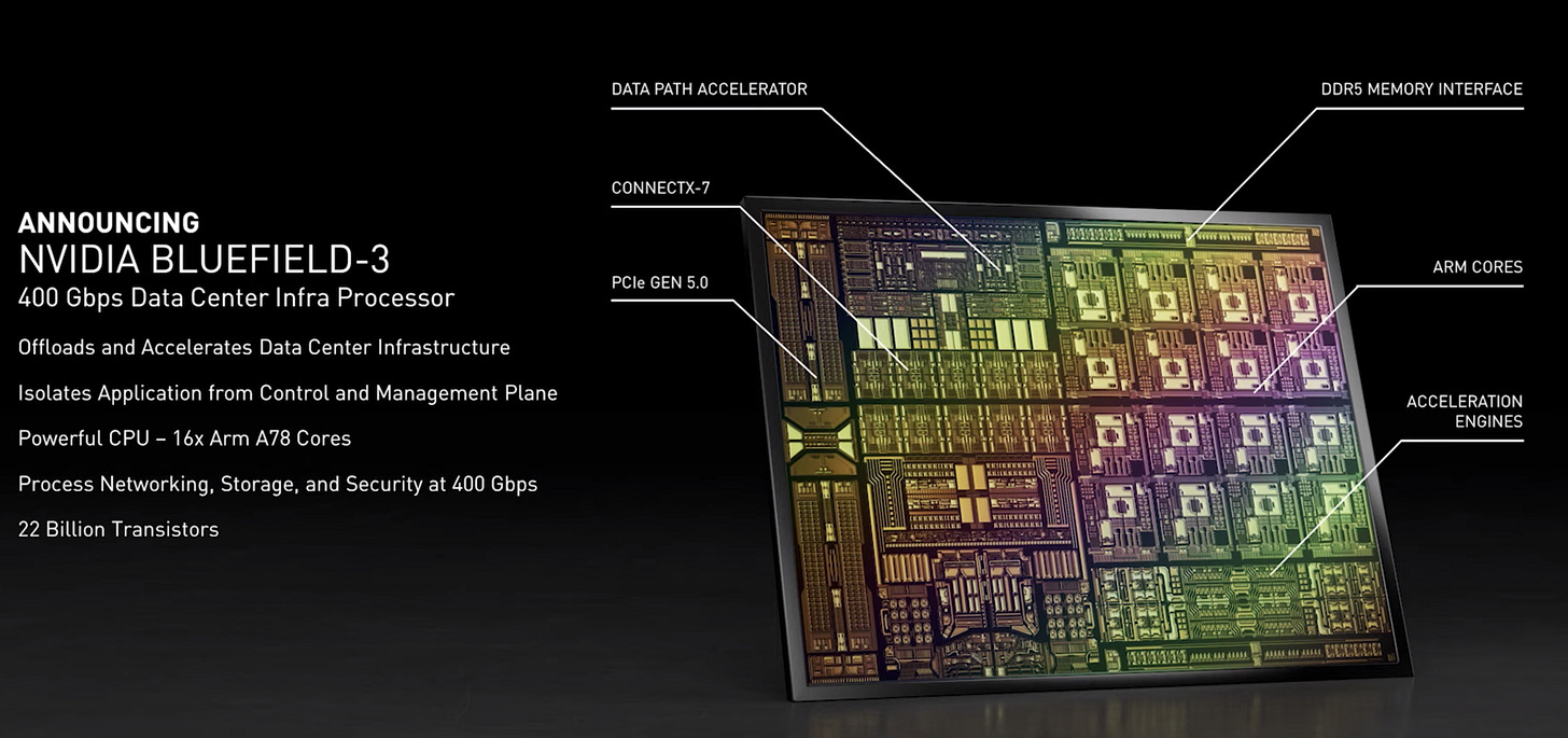 The industry’s first 400GbE/NDR DPU, BlueField-3 delivers unmatched networking performance. It features 10x the accelerated compute power of the previous generation, with 16x Arm A78 cores and 4x the acceleration for cryptography. BlueField-3 is also the first DPU to support fifth-generation PCIe and offer time-synchronized data center acceleration.