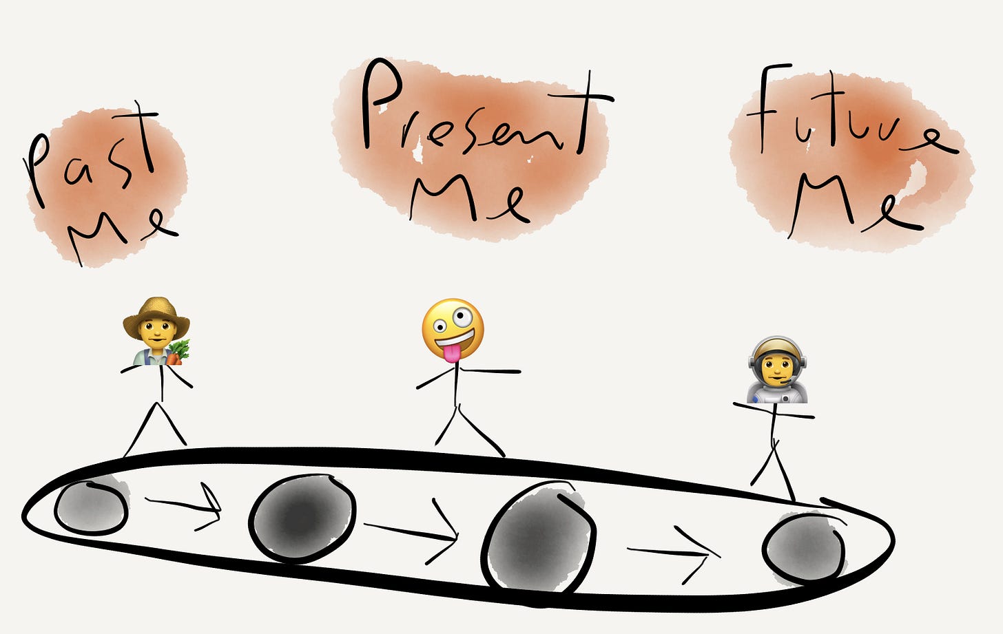Rather than think of yourself as a constant in the story you’re spinning in your head, split yourself into three people. It’s past-me 👨🌾 sending stuff forward to present-me 🤪, and present-me 🤪 sending stuff to future-me 👨🚀.