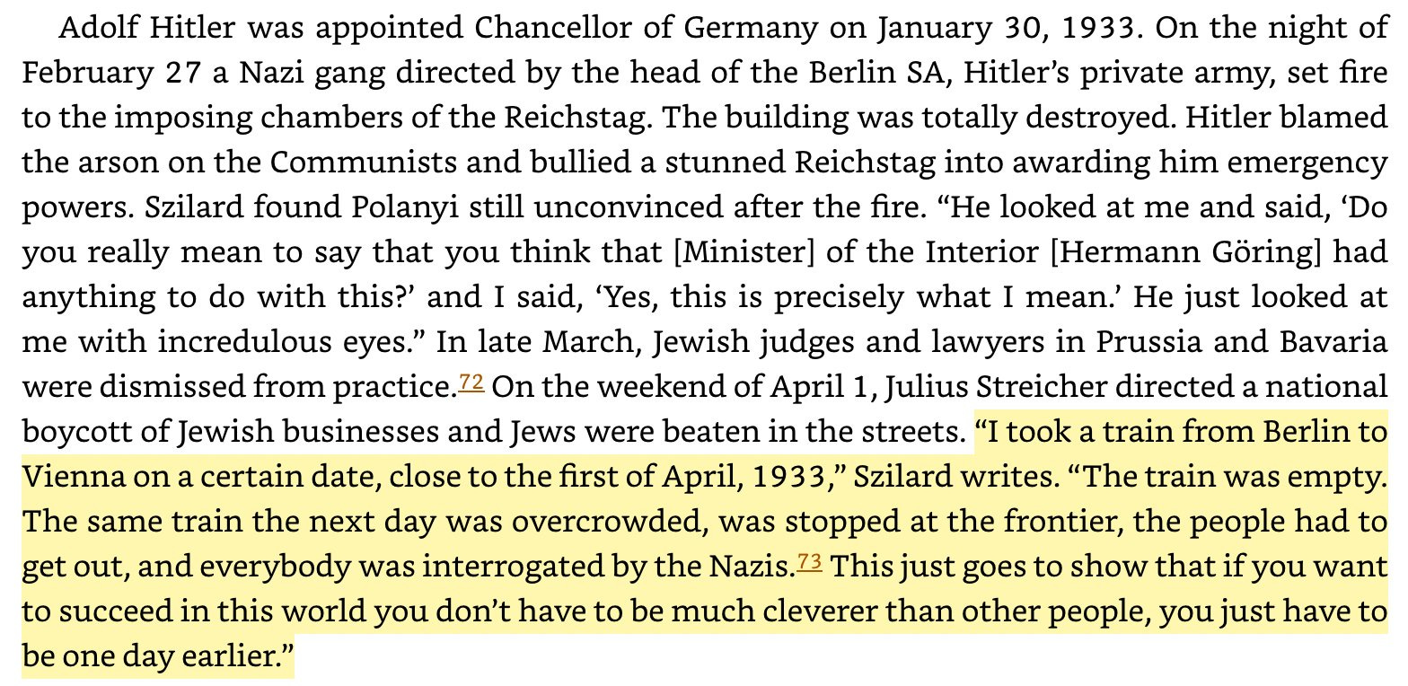 For a dramatic historical example (from *The Making of the Atomic Bomb*), take Leo Szilard’s observations of 1930s Germany: “you just have to be one day earlier”