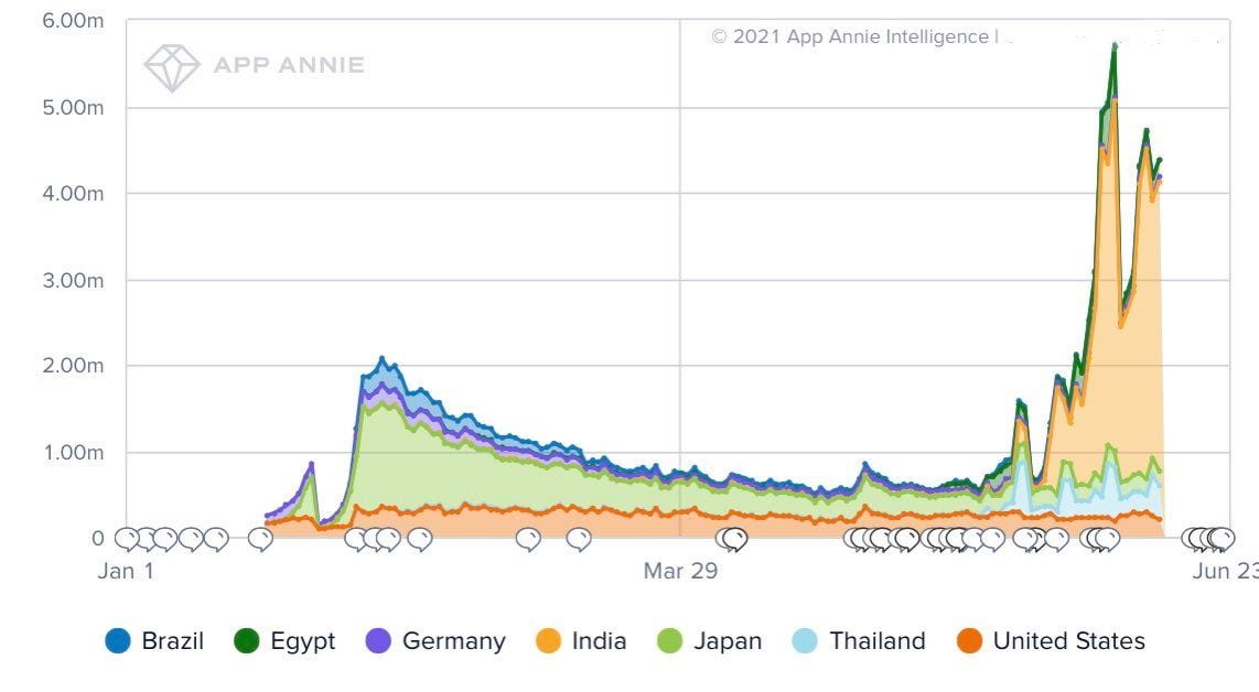 Clubhouse DAUs by country, from AppAnnie, via Cory Wang. Not sure how reliable those numbers are.