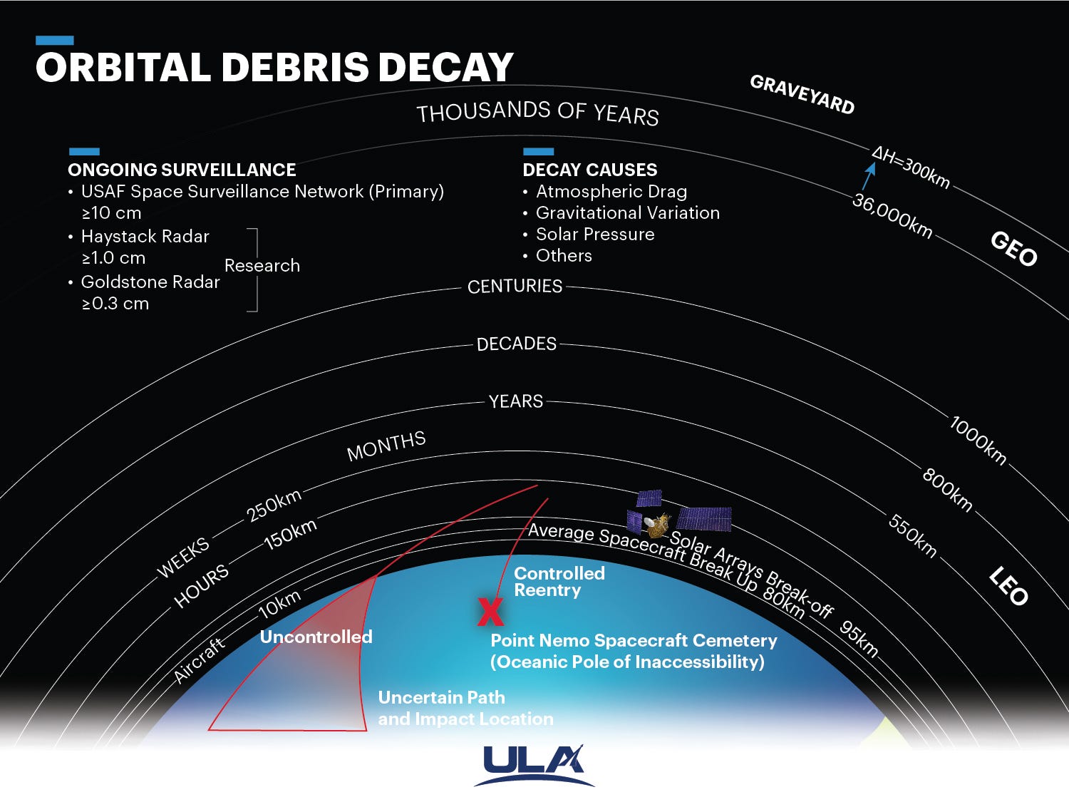 While we’re on the topic, here’s a cool graph from ULA that shows how fast debris decay at different orbital altitudes: