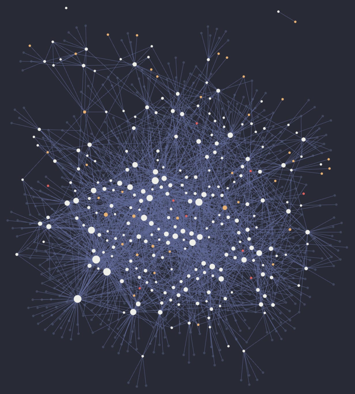 This is what my graph view looks like now (every dot is a separate note, and every line is a connection, such as when one note mentions the other, which is very easy to do in Obsidian with [[brackets]] — one way to picture it is by imagining that you could see a graph view of Wikipedia articles, and see which articles link to other articles):