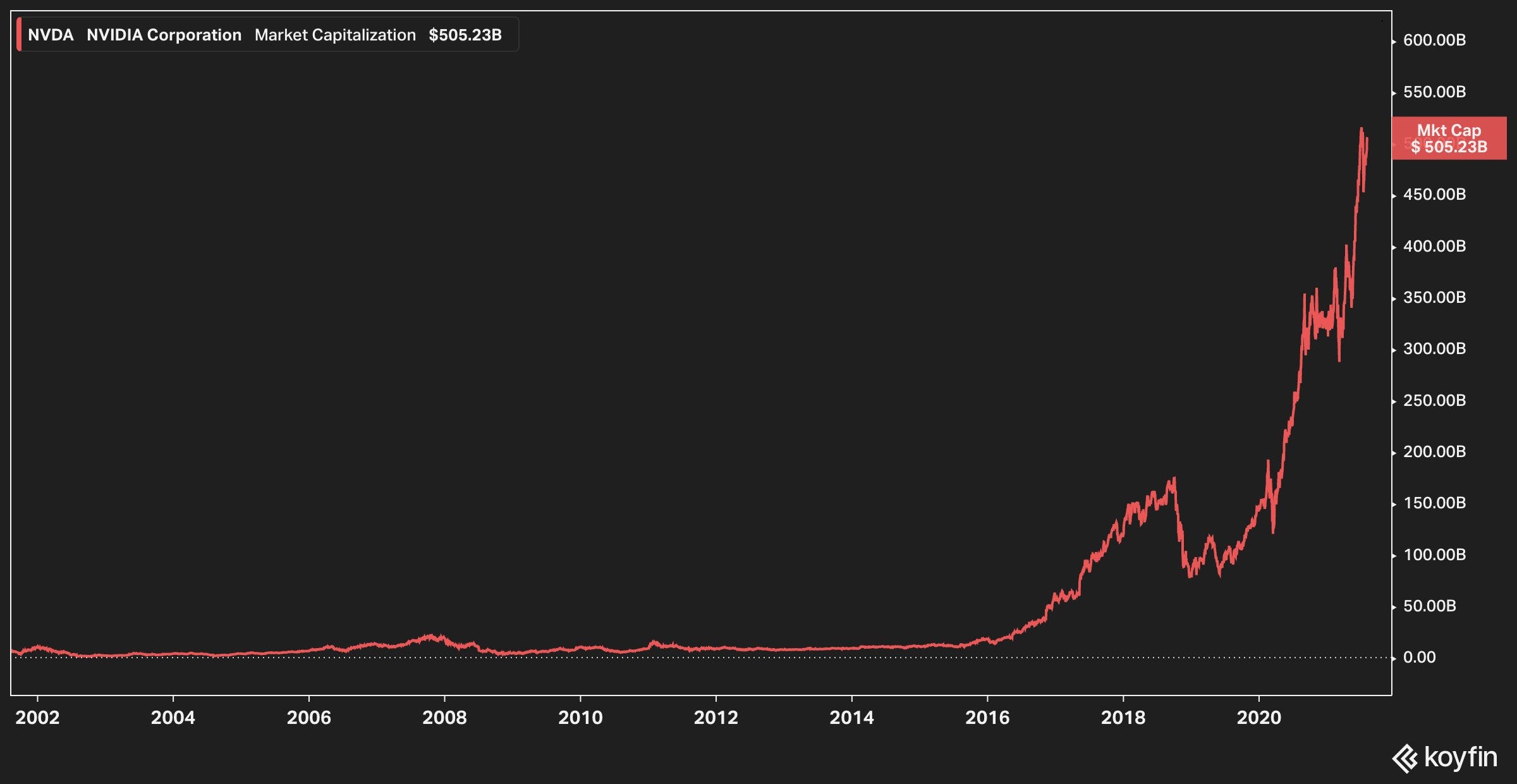 Nvidia spent most of the past 20 years with a market cap under $10bn, and it's now above $500bn.