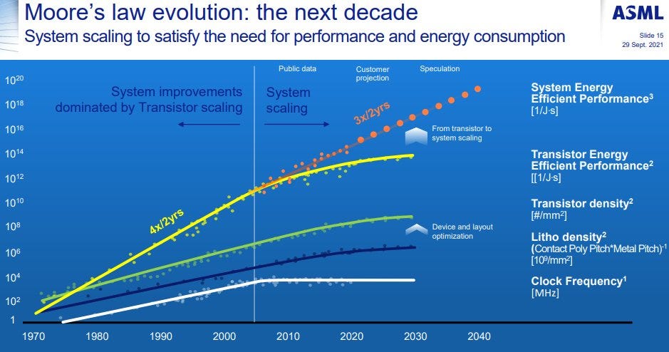 ASML sees litho-density scaling thru at least 2030 and TSMC projects a roadmap for semiconductor scaling out to 2040. Continued semiconductor scaling is great for society!