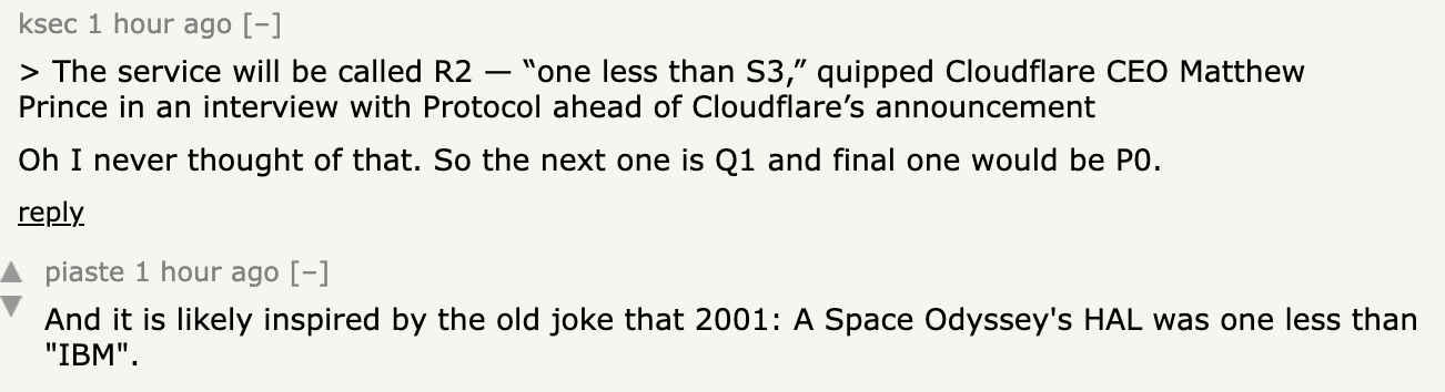 Speaking of Cloudflare, here’s a bonus joke speculating on why they named their recent storage service R2: