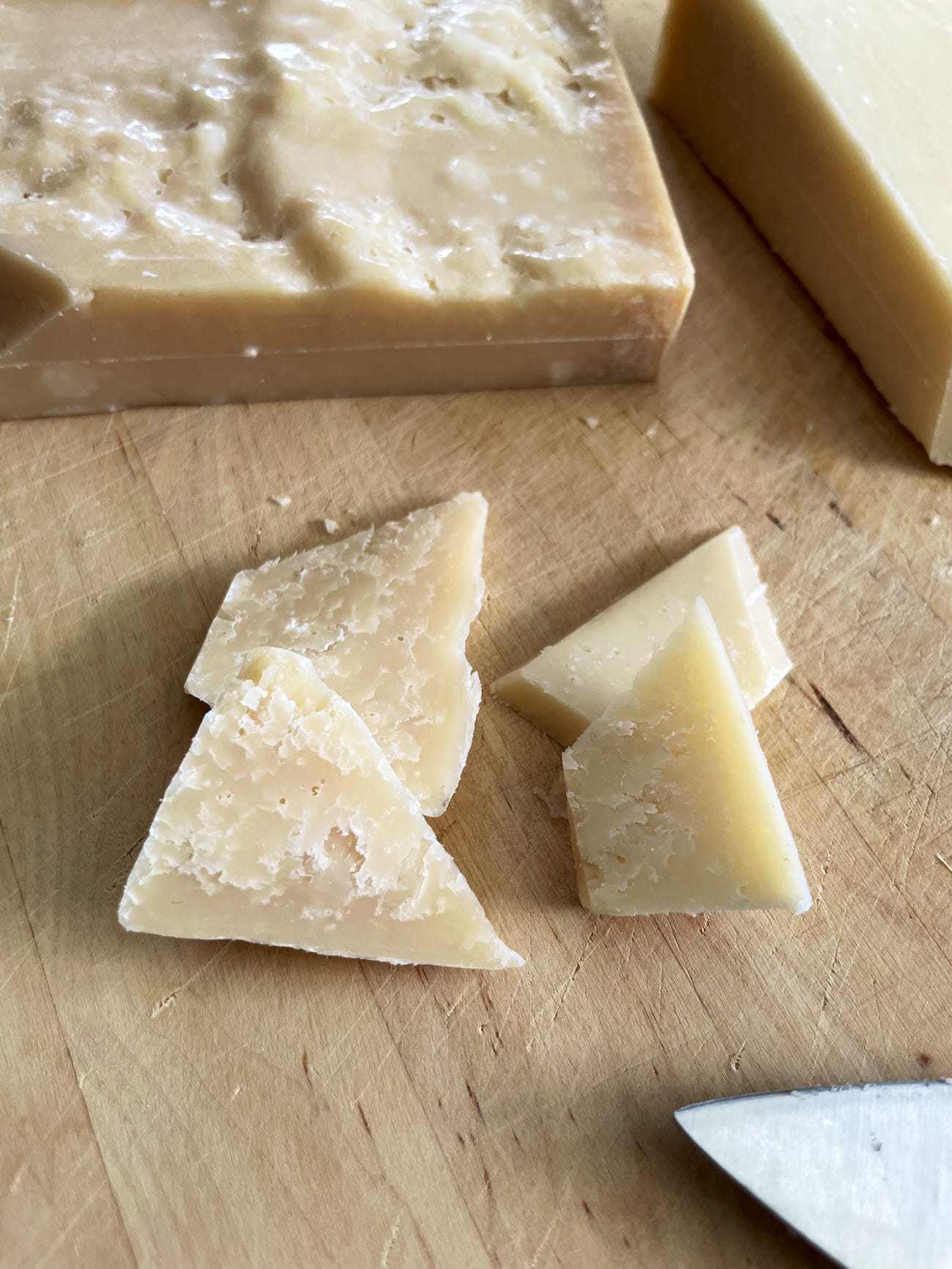 The format of this gameshow is simple: I’m going to put various cheeses that the nice lady at the cheese-shop recommended to me as parmesan-like against the reigning king, the 👑 Parmigiano-Reggiano 👑, and let you know what I think.