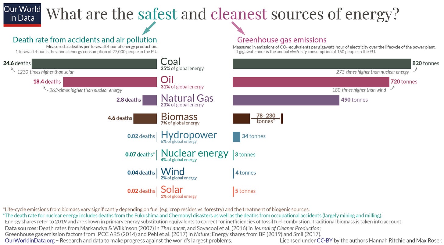 Replacing nuclear energy with fossil fuels kills people. This is likely to be the case in the recent example of Germany. Most of Germany’s energy deficit from scrapping nuclear was filled by increased coal production – which is, as we just saw, the most polluting source with the largest health impacts. Analysis by Stephen Jarvis, Olivier Deschenes, and Akshaya Jha (2020) estimates that Germany’s nuclear phase-out has come at the cost of more than 1,100 additional deaths each year as a result of air pollution. Germany’s plan to make its energy systems safer has done exactly the opposite. (Source)