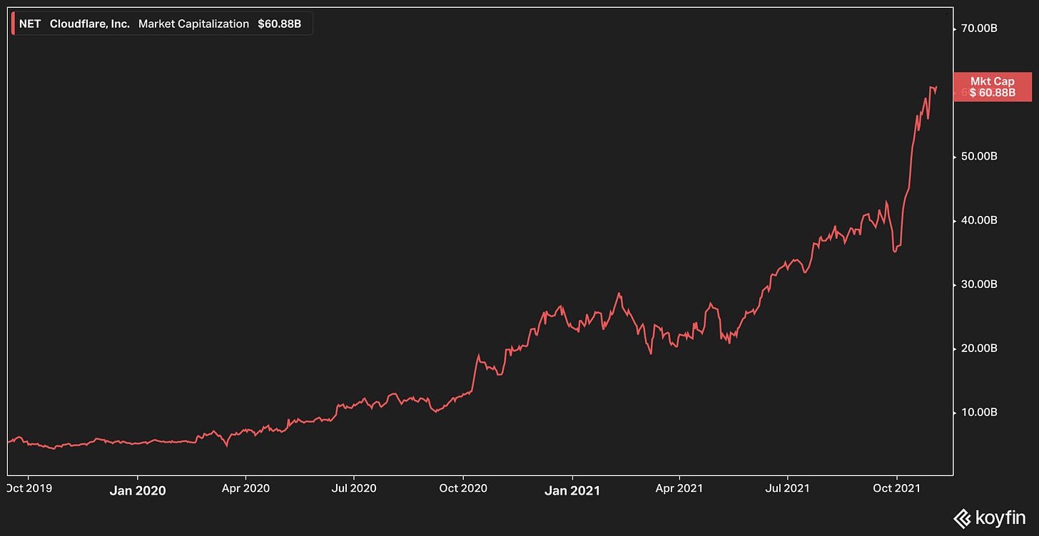 After IPO’ing just ˜2 years ago, Cloudflare has now passed $60bn in market cap, from a starting point around $5bn.