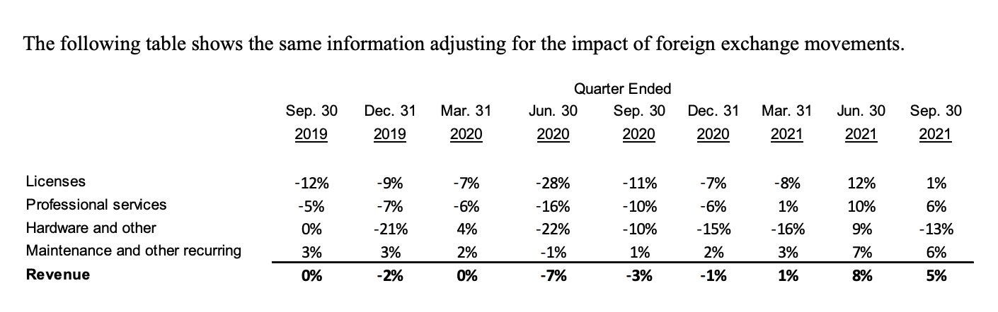 Maintenance and recurring +6% organic ex-FX (that’s where most of the value is created. Not bad at all. -13% on hardware sales, but that’s a lot of non-recurring revenue with small margins… Not every dollar of revenue is made equally).