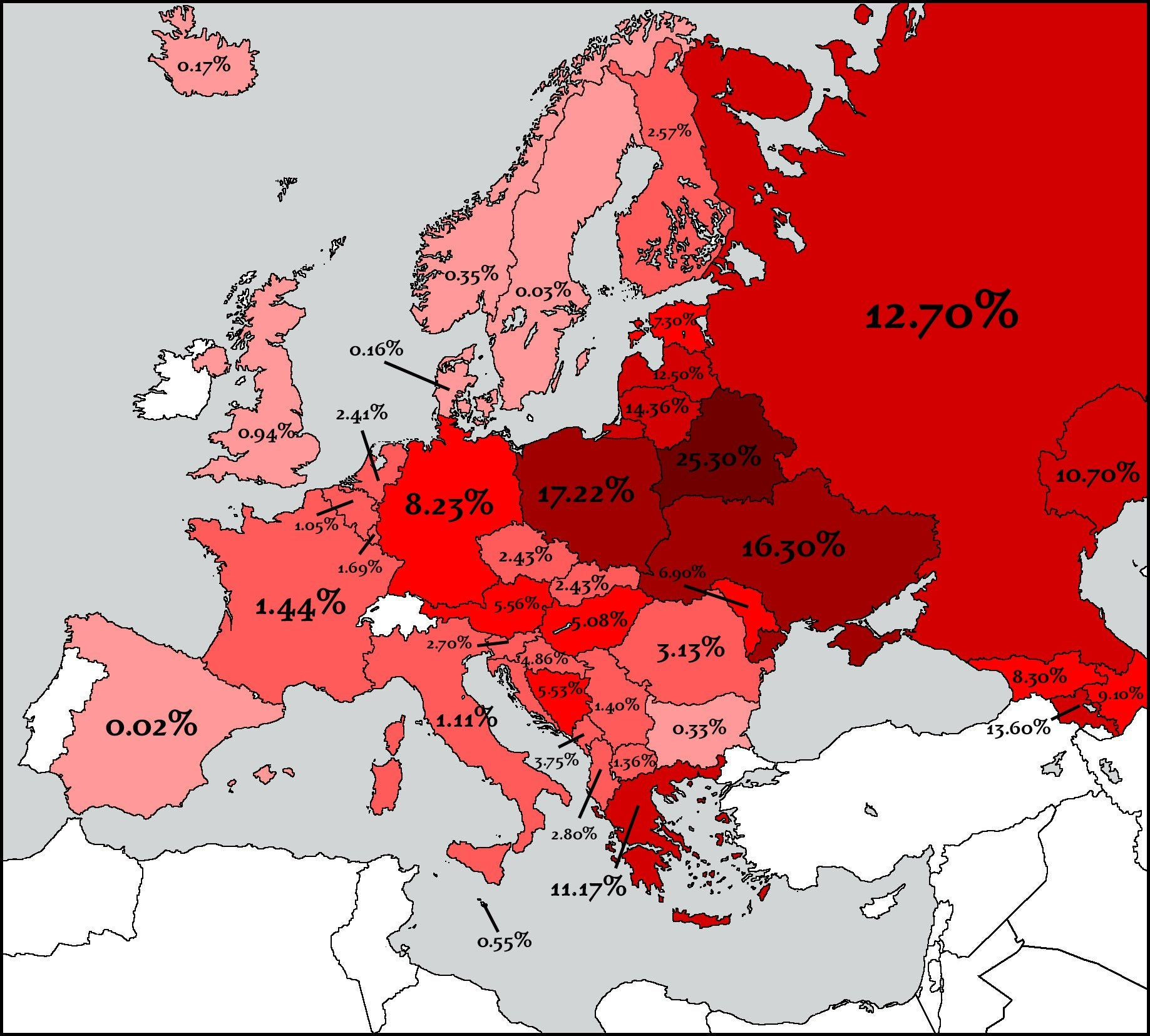 ‘Death toll of WWII in Europe’ (as percentage of population at the time)