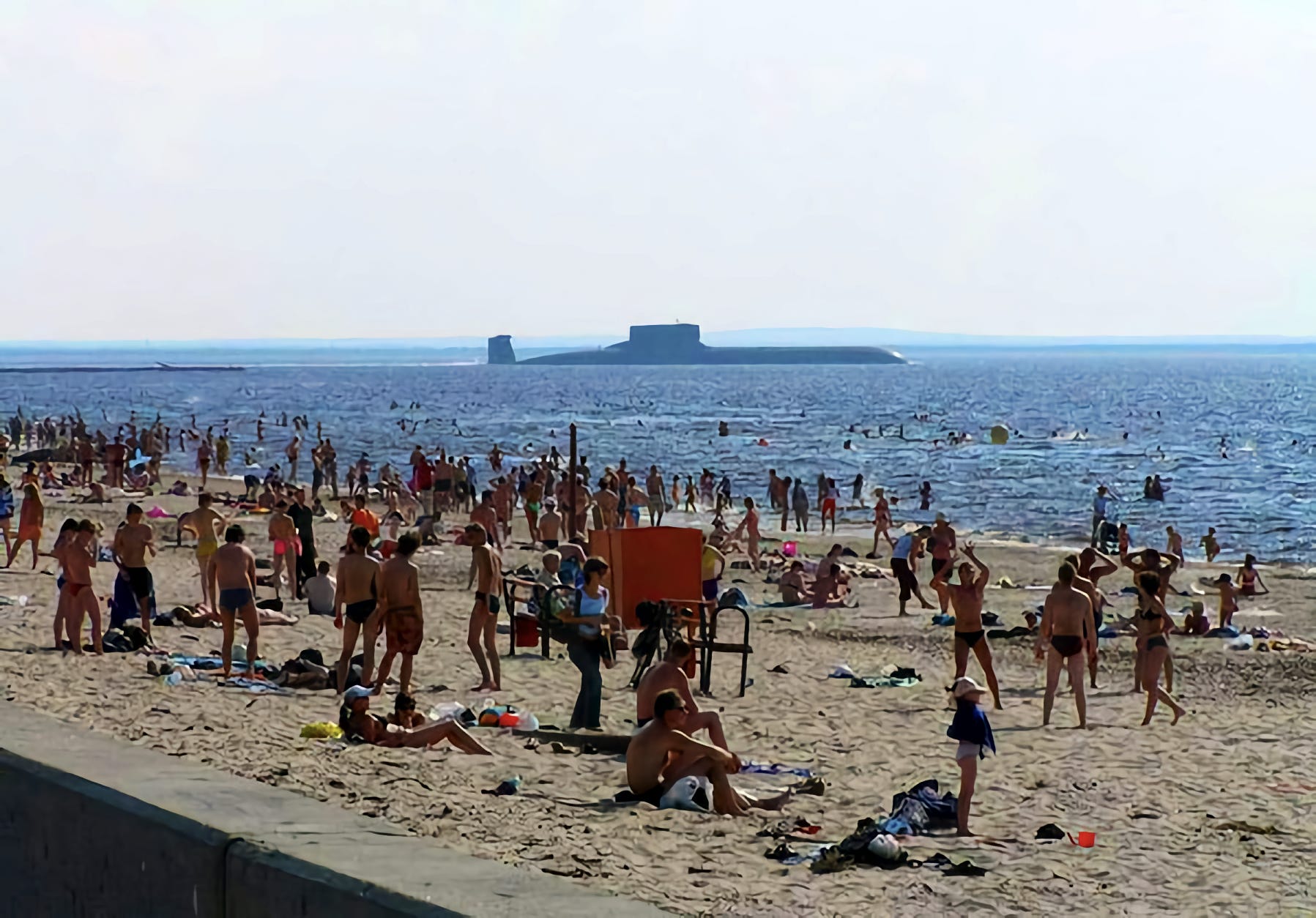 Caption: “Soviet designed and built "Typhoon" Type nuclear submarine as it wafts along a beach in Severodvinsk in the White Sea.”