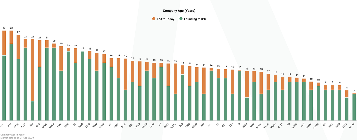 You may have to click to see a bigger version. This graph shows a bunch of software companies, the number on top is their age in years, the green part of the bar is how long they existed pre-IPO, and the orange part is from IPO to today.
