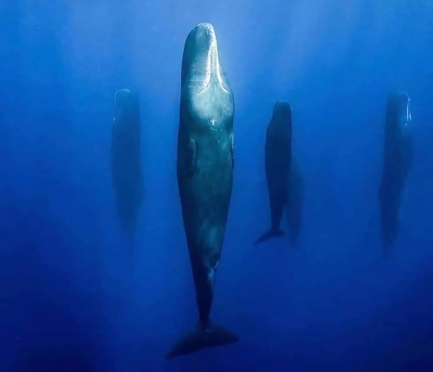 ‘A pod of Sperm Whales sleeping in the middle of the open ocean’
