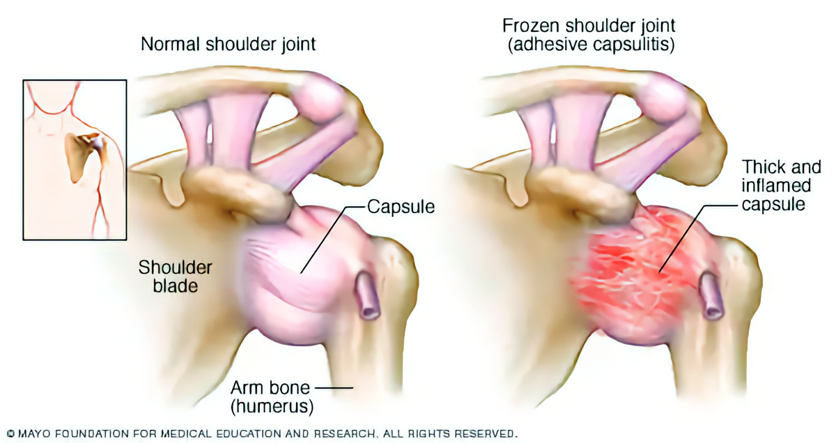 The bones, ligaments and tendons that make up your shoulder joint are encased in a capsule of connective tissue. Frozen shoulder occurs when this capsule thickens and tightens around the shoulder joint, restricting its movement.Apparently, this can take a while to get better, up to a year+.