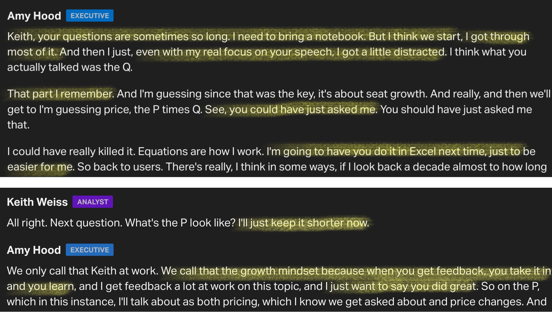 Some people on Twitter say she’s arrogant. I don’t see it. This is the big leagues. If you’re going to waste the time of the #2 at Microsoft with a 3-paragraph-rambling-question, it’s fair to expect this type of mild pushback/ribbing.