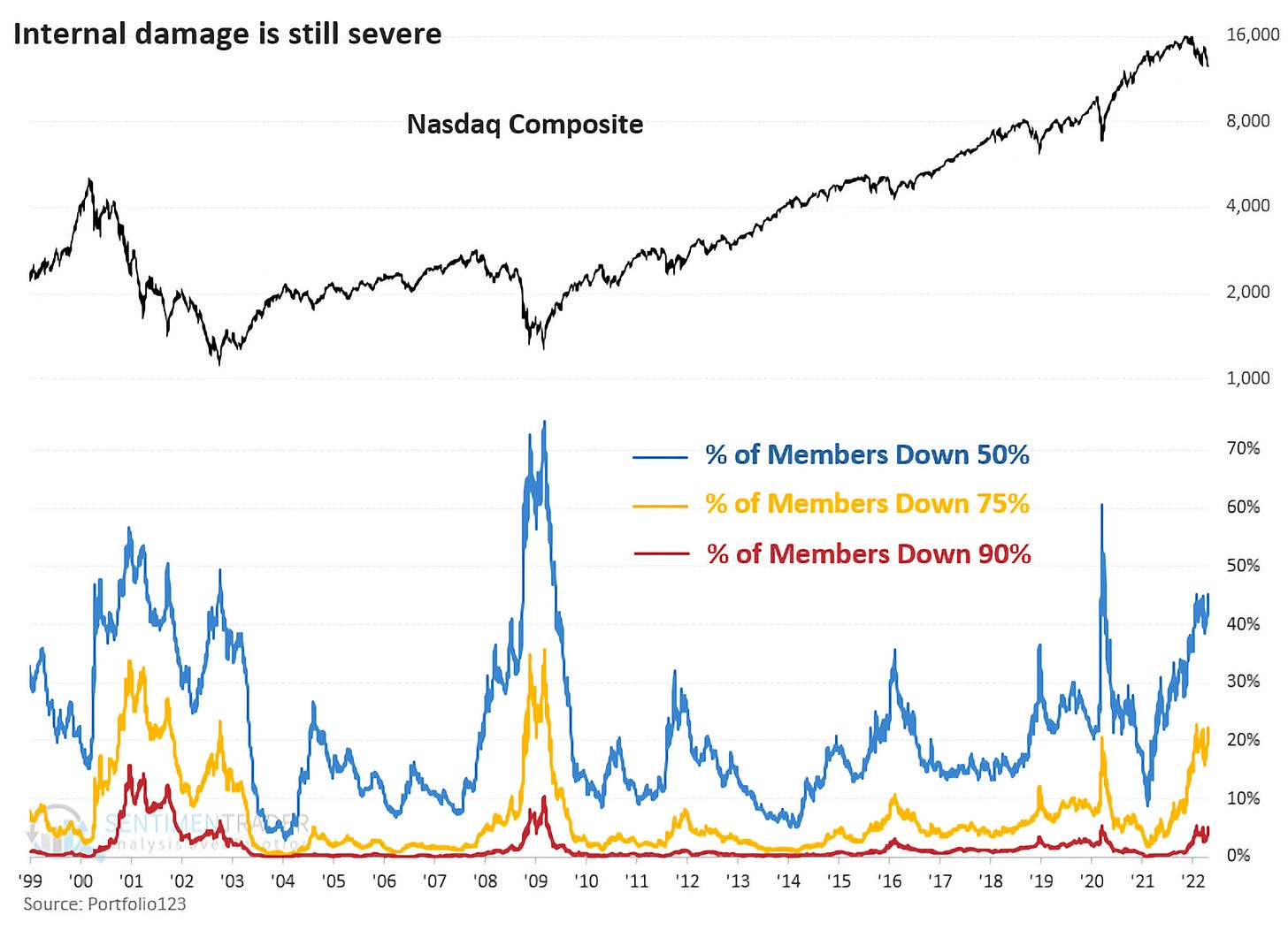 Averages can hide a lot of what is going on below the surface. The chart above, via Jason Goepfert, shows some of what is going on ‘inside’ the Nasdaq: