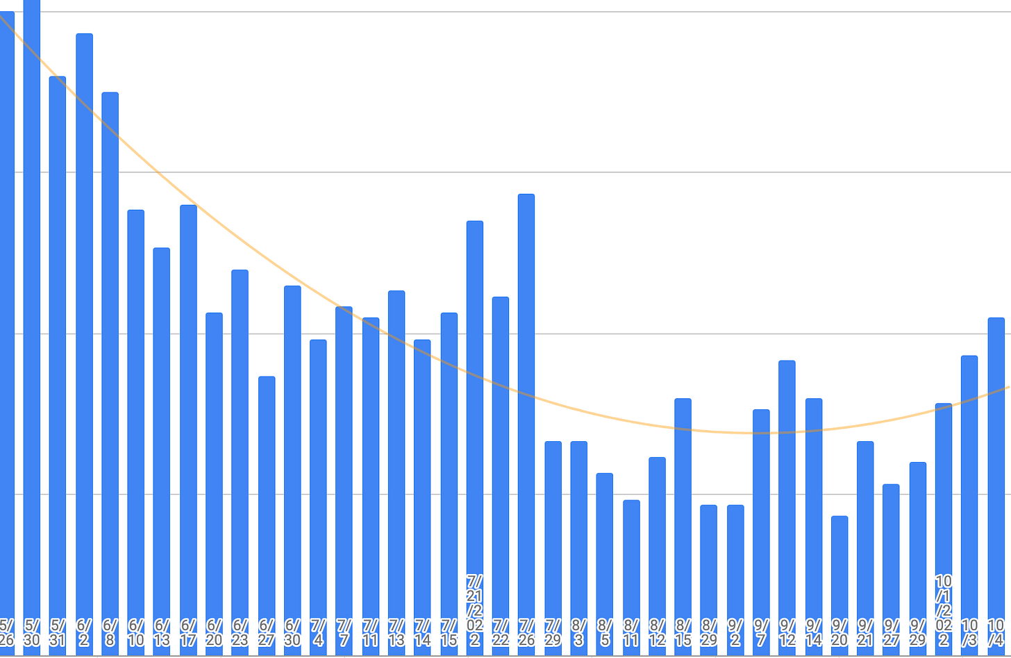 You know I’m a nerd, so of course I track metrics every time I run. This is my pace (in min/km) since I started: