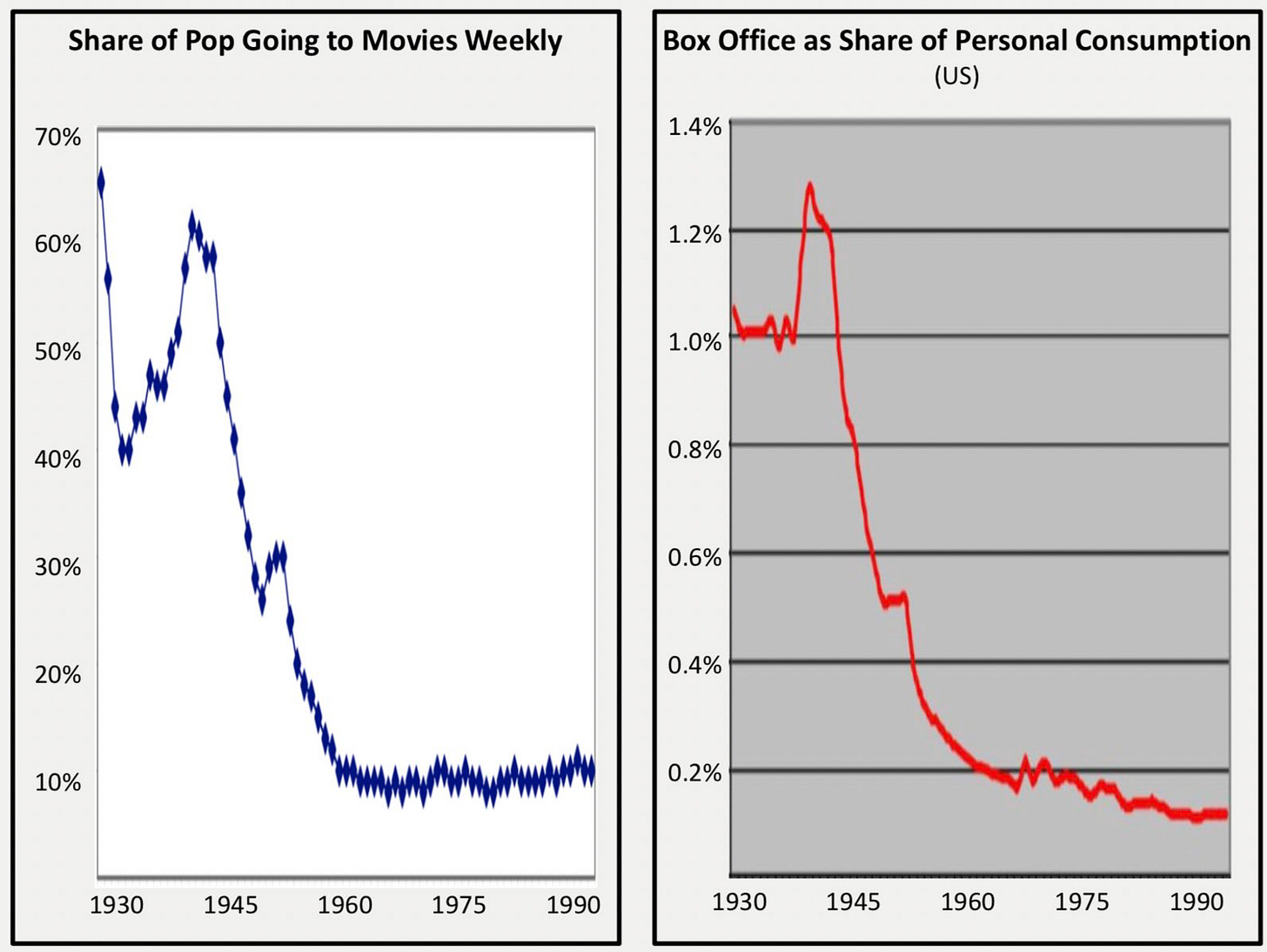 And if you showed this chart to any film exec from 1920-1950, they’d doubtlessly assume it reflected the cataclysmic end of the medium altogether, when in fact outputs are up over 100x and revenues even more