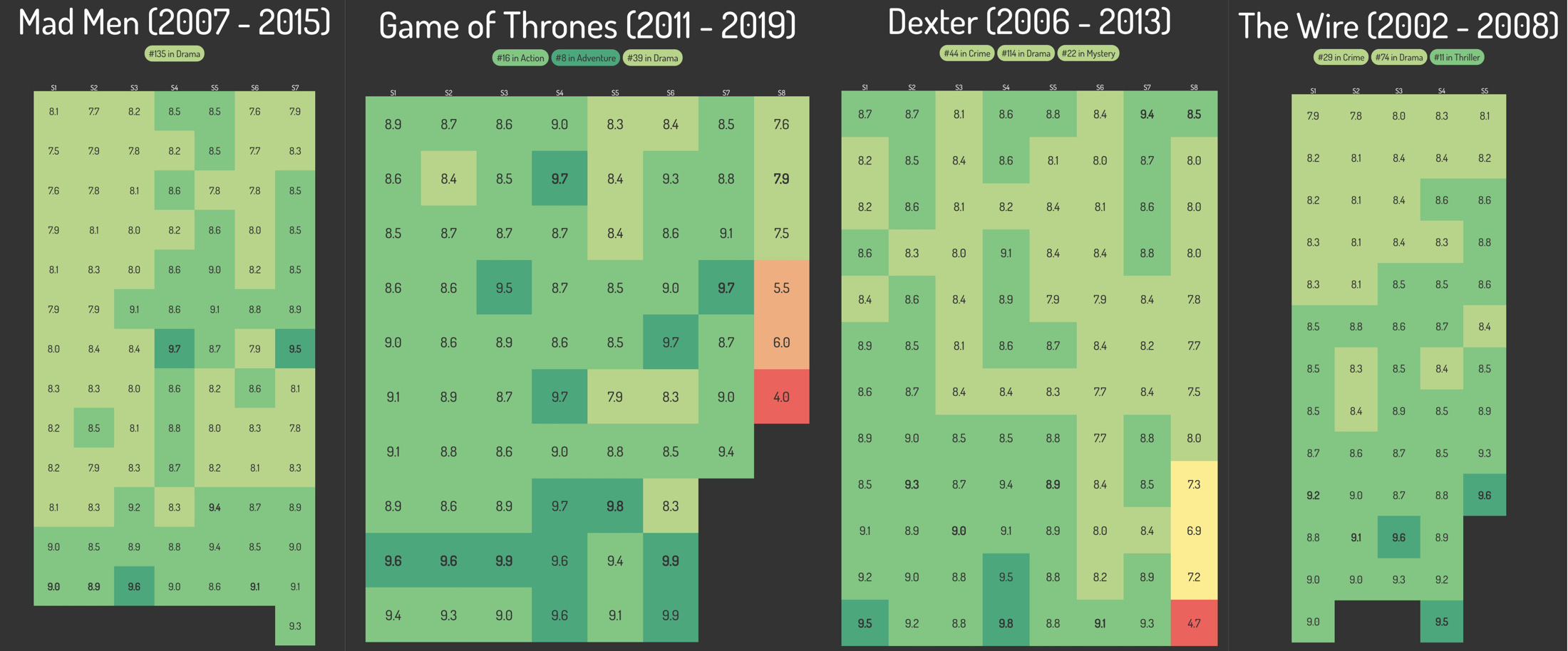 What to Watch on TV is a fun & useful site where you can see per-episode IMDB ratings for TV shows. It makes it very clear when certain shows jump the shark 🦈 or have widely disliked finales…