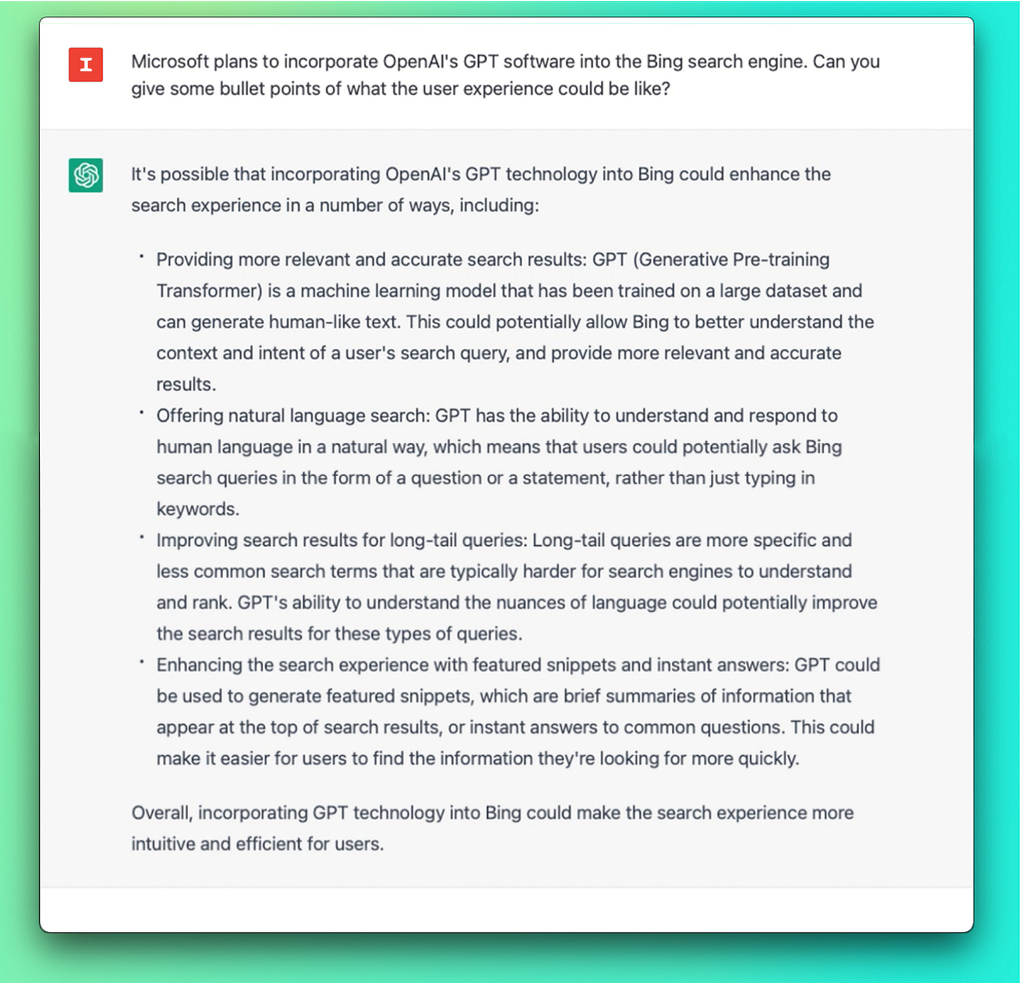 There may be an interesting dynamic at play here, where because Bing is much smaller than Google, it would be less expensive for it to integrate more LLM tech into its search engine while gaining more relative upside from it.
