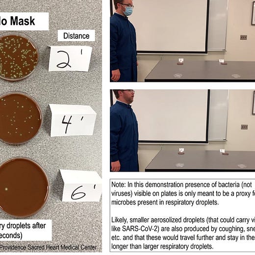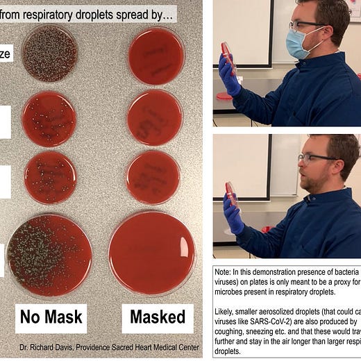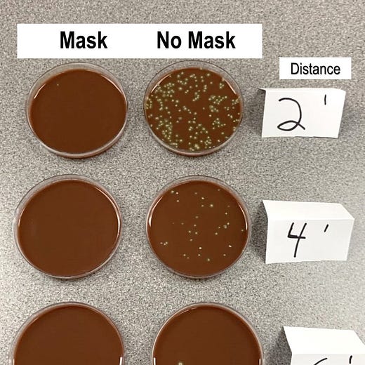 The guys at AsapSCIENCE replicated this experiment from microbiologist Richard Davis on the ability of simple masks (surgical or homemade cloth, in this case) to reduce or stop the spread of respiratory secretions (he addresses that these cultures are bacteria and not viruses, but the point is that both are carried by the same droplets, so blocking them will block a lot of both):