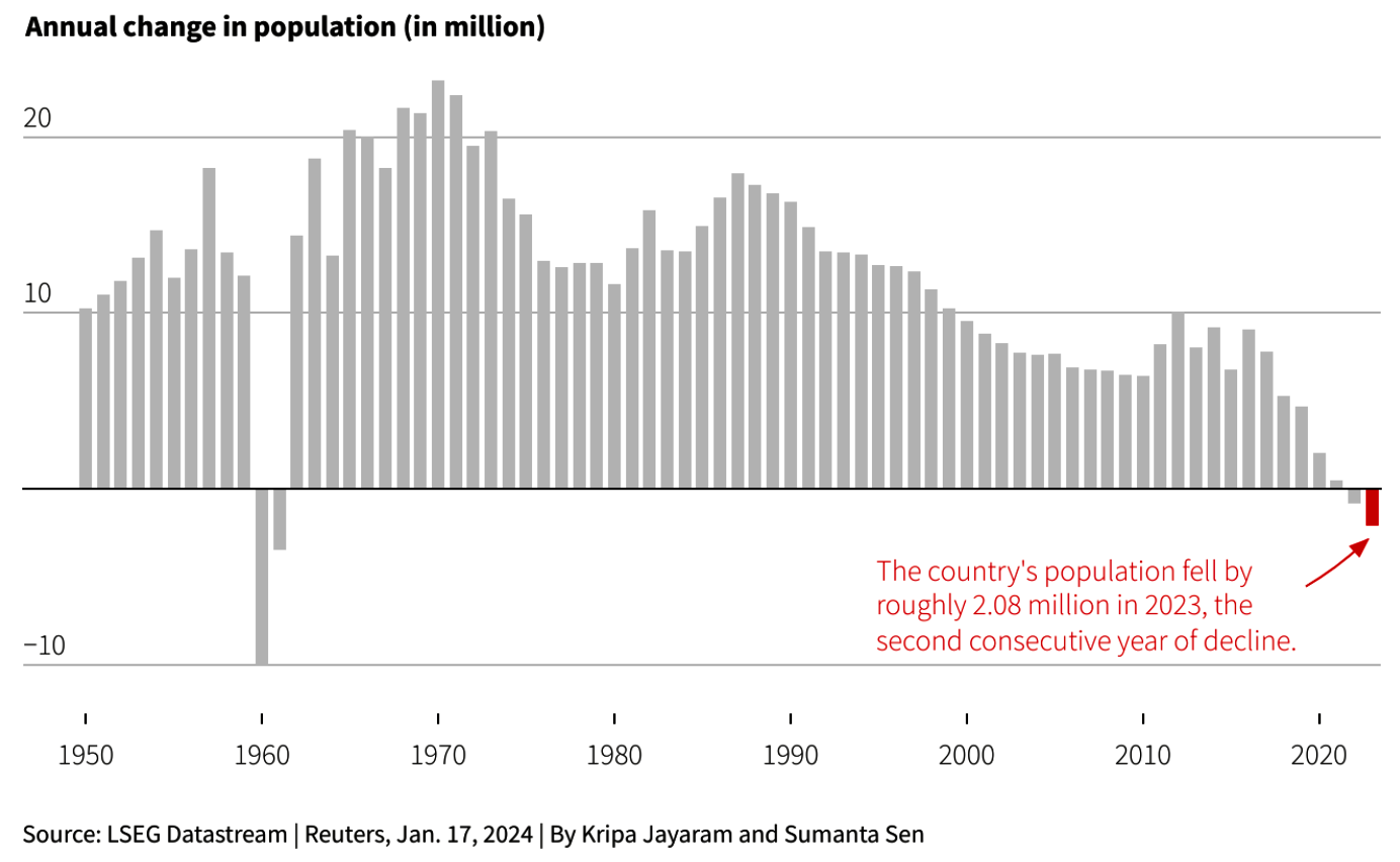 That was well above the population decline of 850,000 in 2022, which had been the first since 1961 during the Great Famine of the Mao Zedong era. (Source)