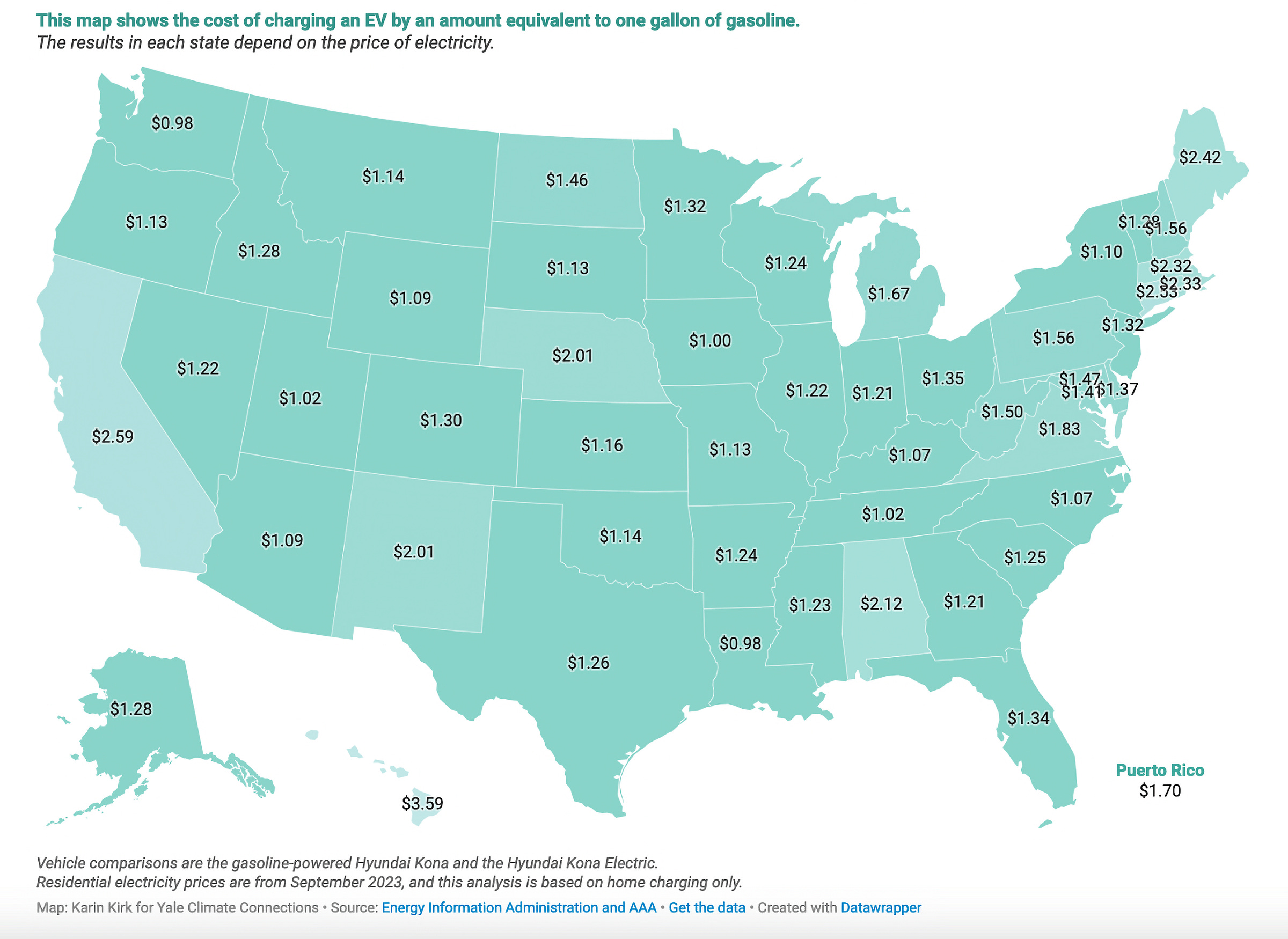Important point: This map doesn’t take into account variable electricity rates and EVs tend to be charged overnight, so the real-world numbers are lower in many states, particularly in places like California where there’s a big difference between peak rates and off-peak rates (it can be less than half).