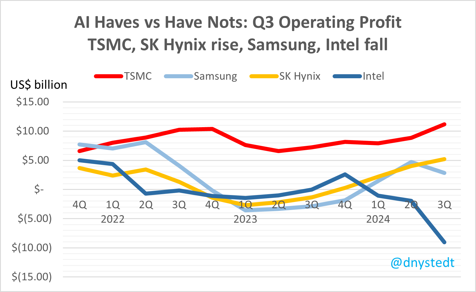Dan Nystedt calls it ‘the AI haves vs have-nots’ (which reminds me of friend-of-the-show Dylan Patel’s ‘GPU rich’ and ‘GPU poor’) as TSMC and SK Hynix separated from Samsung and Intel.