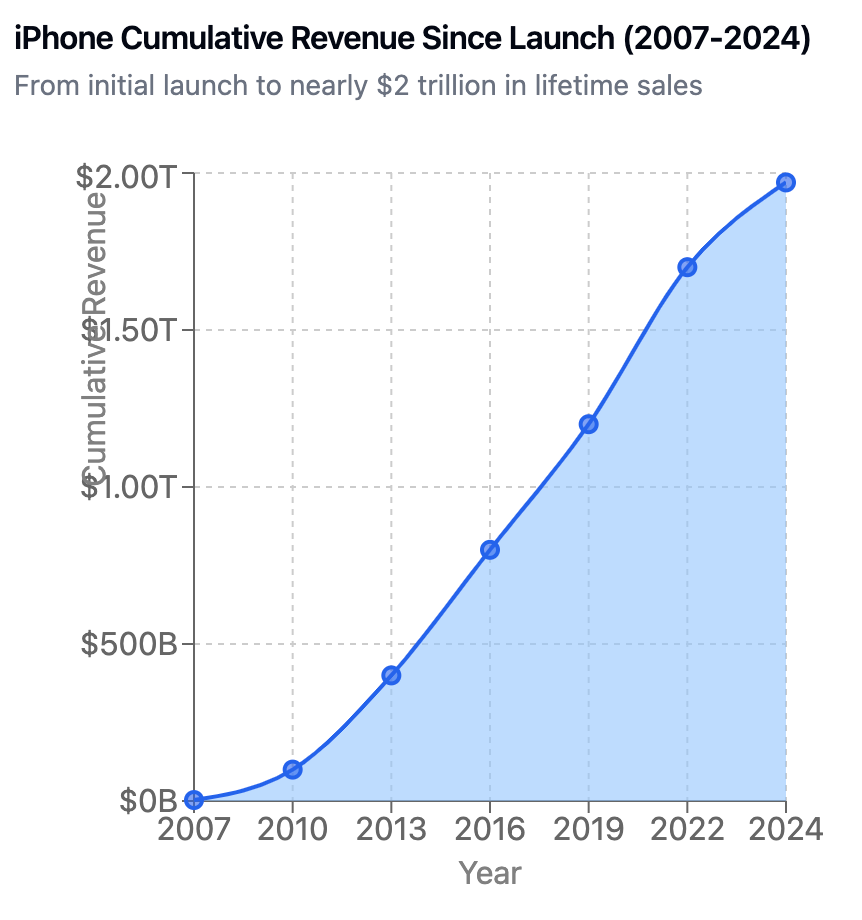 This made me curious about the cumulative revenue from the iPhone since its launch in 2007 — just the phone itself, not the service revenue related to it, or the ecosystem benefits of people buying iPhones and then buying other Apple products.