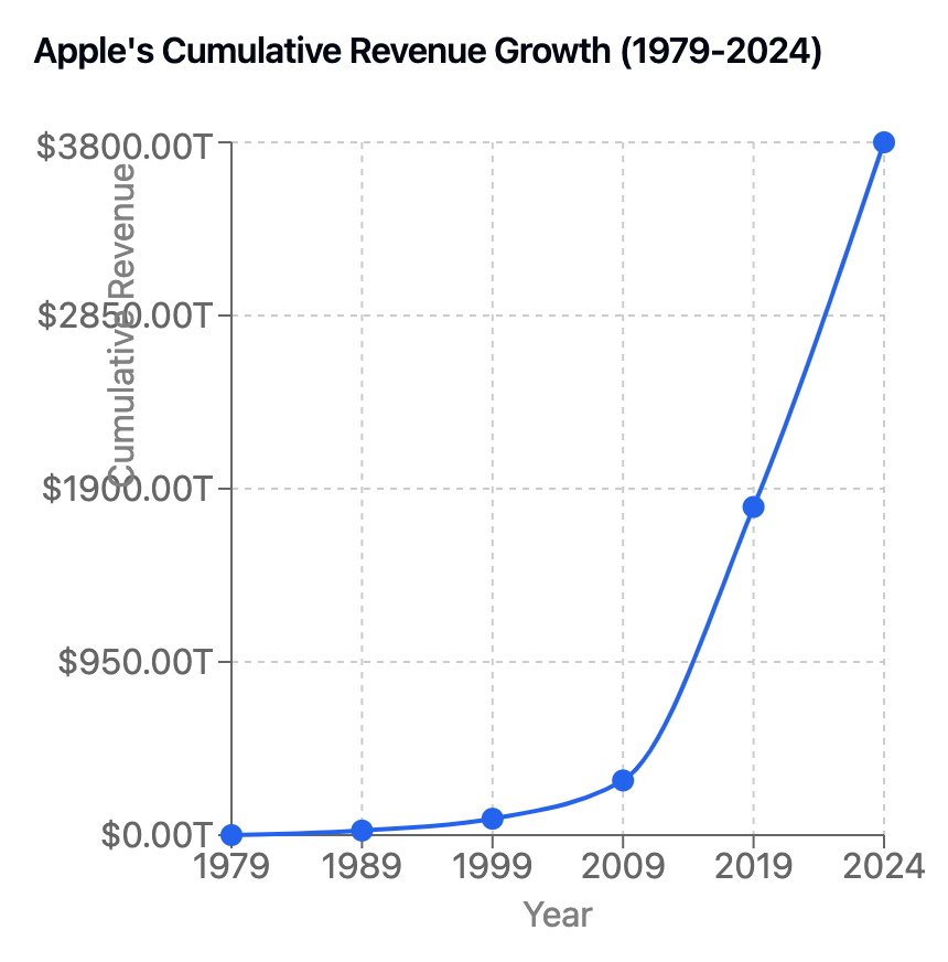For fun, I tried to estimate the total cumulative revenue for all of Apple since it was founded (🍏 1976-2024 🍎). I got ˜$3.8 trillion (🤯🤯🤯)