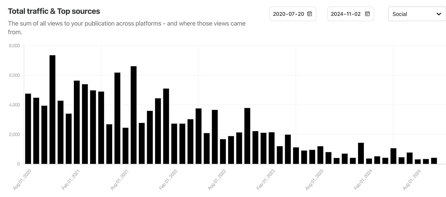 The graph shows traffic from social sources to this steamboat 🚢⚓️ (ie. almost all from Twitter since that’s where I’m active). Despite growing my subscriber base *tenfold*, I now receive less Twitter traffic than when I had a couple thousand subscribers, making the decline even more significant than it appears.