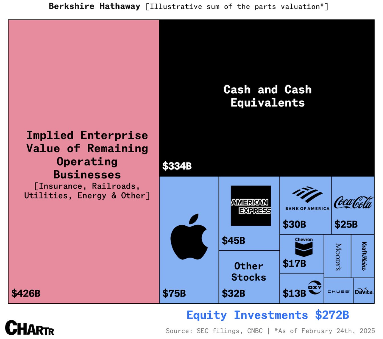 BRK has $650 billion in shareholders’ equity, and $272 billion is invested in stocks. Sure, that looks low, but a lot of BRK net worth is tied up in equity of their wholly-owned/consolidated and equity-method investments. For example, the Railroad, Utilities and Energy segment has equity of $130 billion. That’s as much ‘equity’ as stocks (but just not marked to market every day). That brings up the total equity exposure to $402 billion.