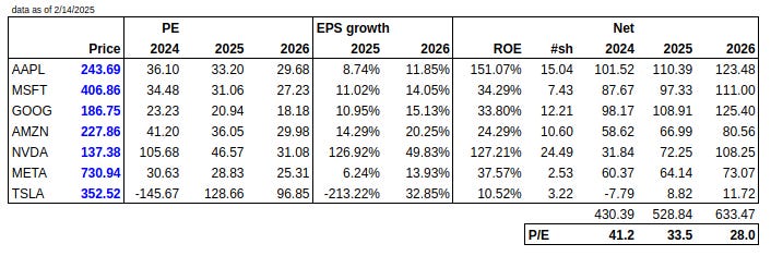 Let’s say the Mag 7 was a modern-day, techful version of a conglomerate like BRK. Its subsidiaries have grown tremendously in the past 5 and 10 years. Earnings will collectively grow 23% in 2025 and 19% in 2026 (willful suspension of disbelief may be key here), and look at the high ROE of each division (OK, I was too lazy to calculate a weighted average).