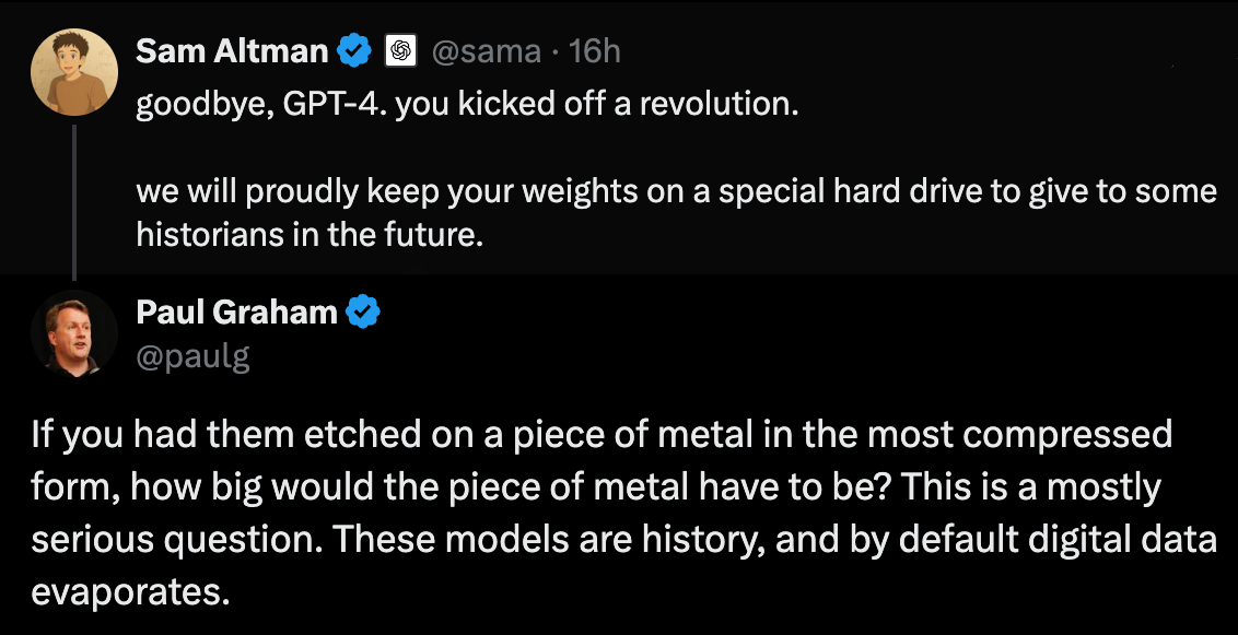 🤖→💾→🧬🧬🧬🧬 As GPT-4 is being taken offline, Paul Graham tweeted to Sam Altman about finding a way to preserve the historic model for posterity: