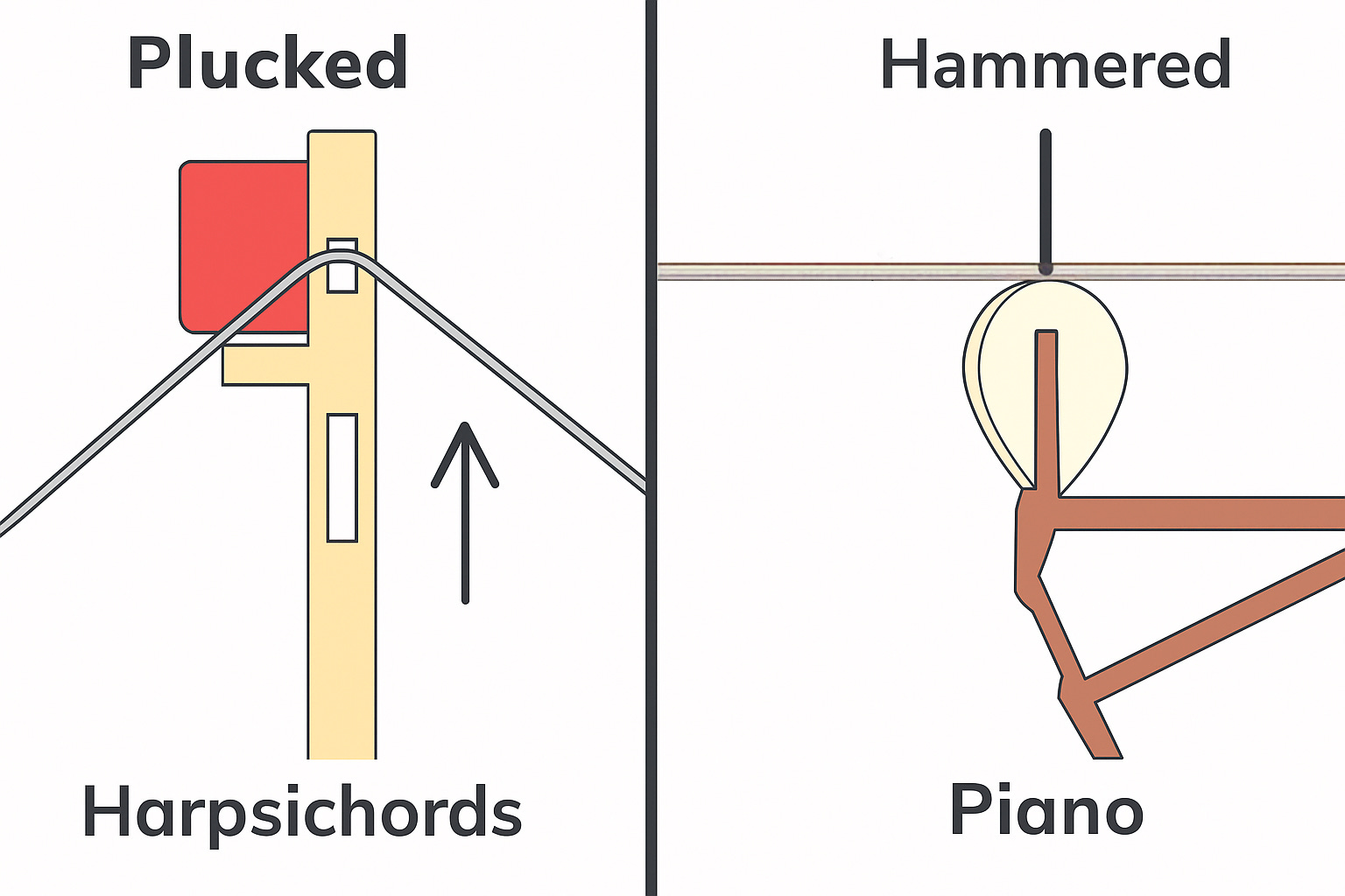 A harpsichord uses quills or plectra (imagine small guitar picks) to pluck the strings when a key is pressed. This plucking gives a more brittle, percussive, and uniform tone, with little variation in volume. Press a key harder, and it doesn’t get louder.
