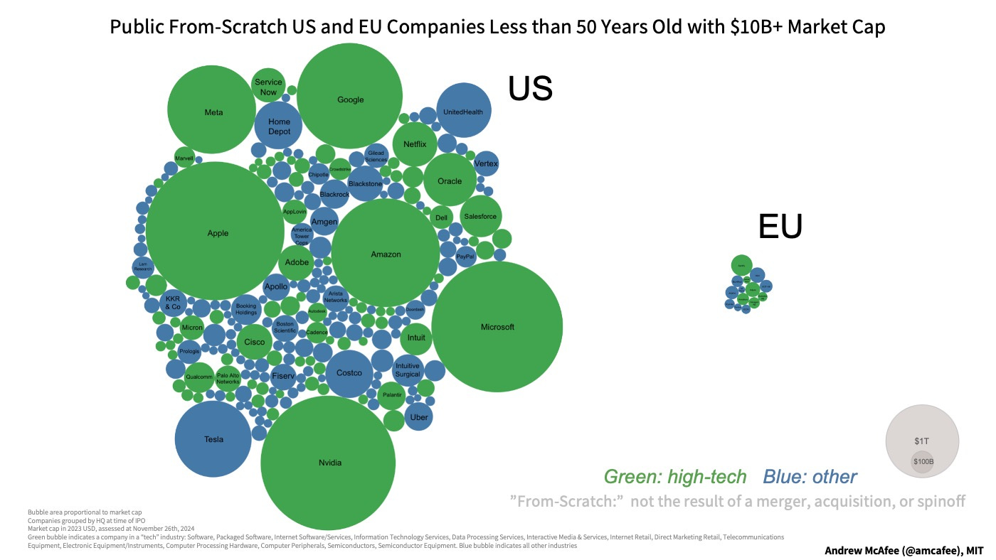 It shows public companies in the US and EU that are less than 50 years old, have at least a $10bn market cap, and aren’t just the result of a merger/spinoff/etc. It’s an imperfect but useful proxy for dynamism, and the difference is so striking that it’s hard to explain away, even if we want to steelman Europe’s approach.