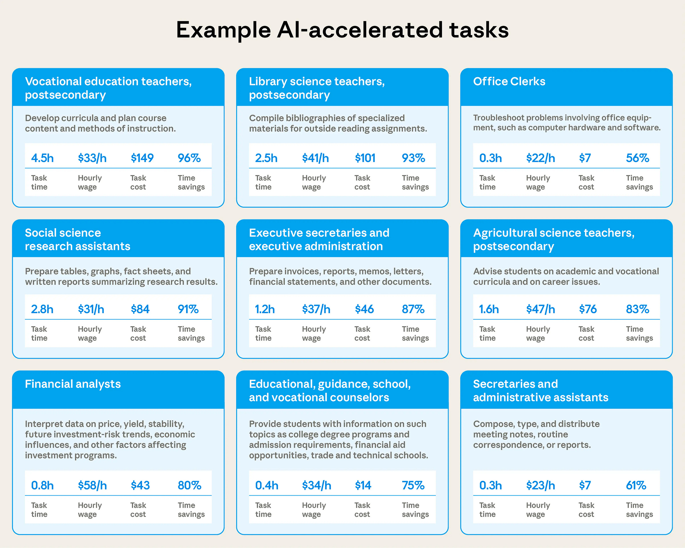 Across one hundred thousand real world conversations, Claude estimates that AI reduces task completion time by 80%. We use Claude to evaluate anonymized Claude.ai transcripts to estimate the productivity impact of AI. According to Claude’s estimates, people typically use AI for complex tasks that would, on average, take people 1.4 hours to complete. By matching tasks to O*NET occupations and BLS wage data, we estimate these tasks would otherwise cost $55 in human labor.