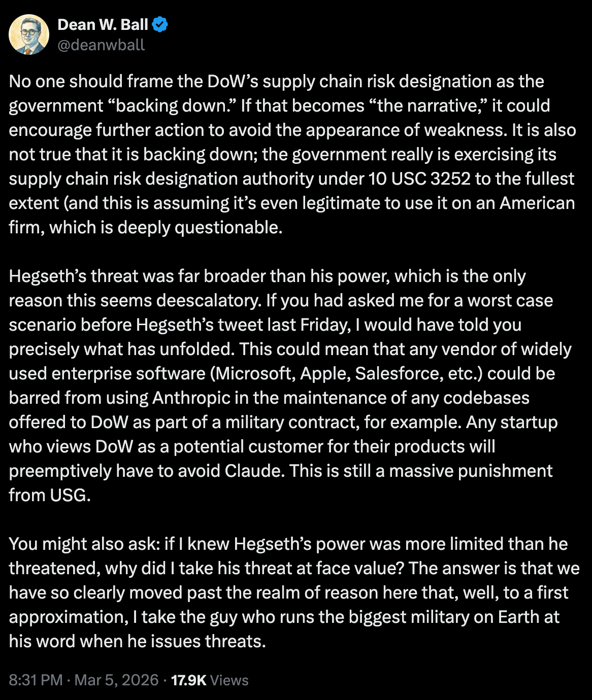 The supply chain risk designation has been confirmed, but with a narrower application than what the SecDef first claimed (which would have been a killshot). All this scrutiny probably means that OpenAI’s deal with DoD will be tighter than it would otherwise be, if only because they don’t want more AI researchers to quit. It’s all about incentives.