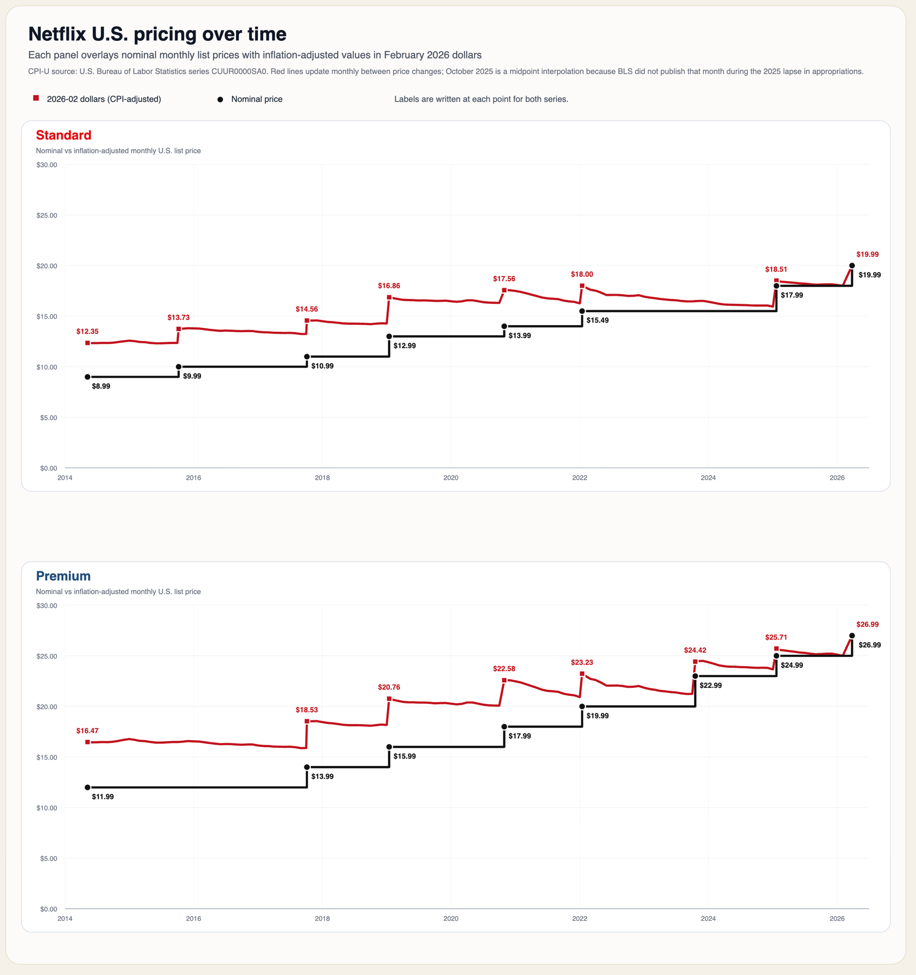 The idea for this came from Paul Crowley. He asked Claude to create a graph of Netflix pricing in the U.S. over time, along with the inflation-adjusted prices in today’s dollars.
