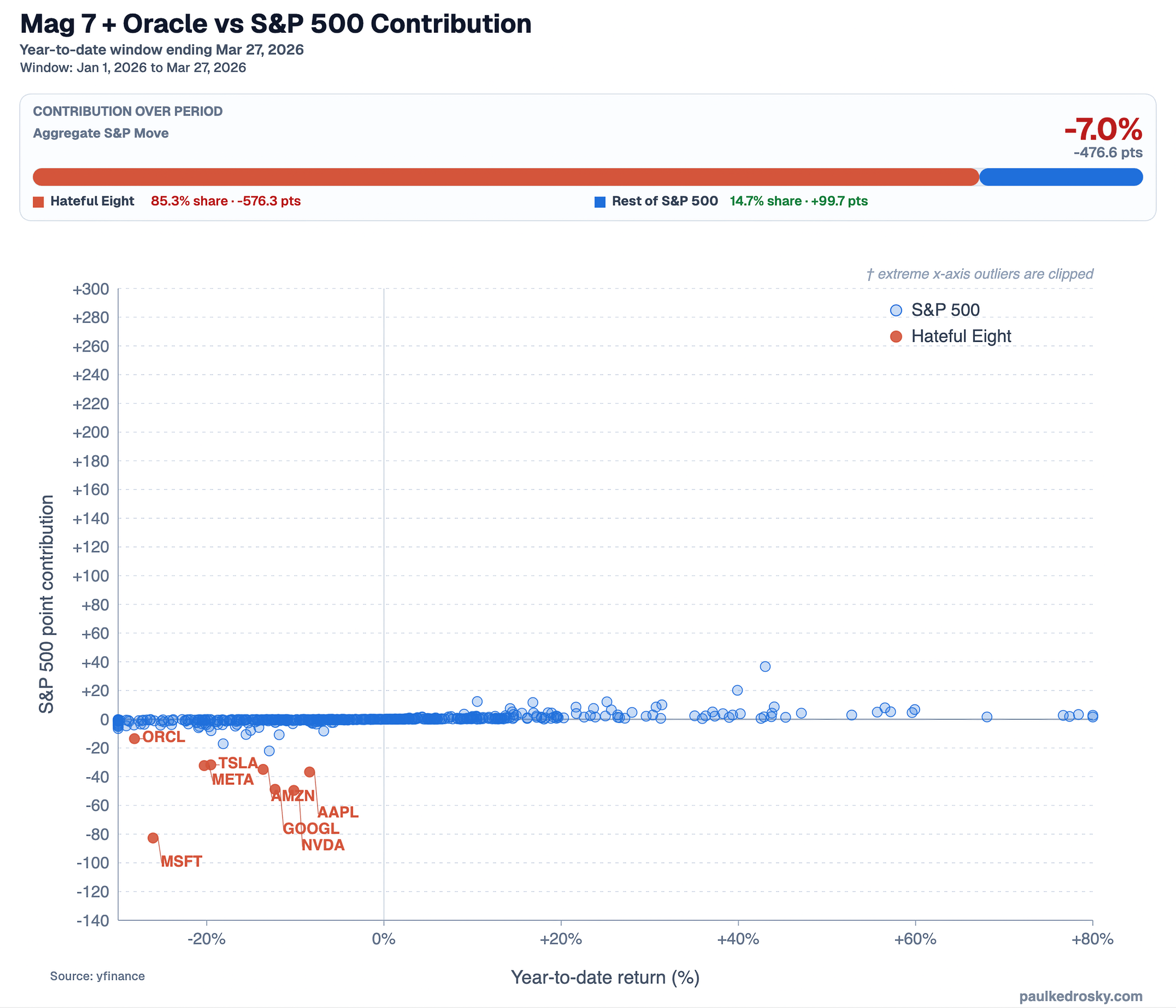 The “Hateful Eight” — the Mag 7 + Oracle that drove index gains for the past two years — account for 85% of the year-to-date drawdown, subtracting roughly 576 points. The other ~490 companies collectively added about 100 points.