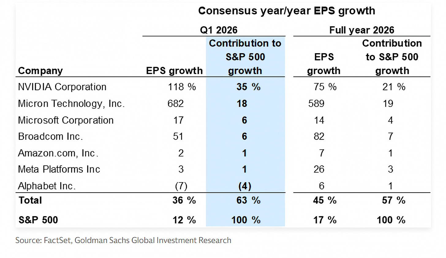 Speaking of concentration: Nvidia alone represents 35% of the S&P’s Q1 earnings growth, while the much smaller Micron ($370bn market cap vs $4.2 trillion for Nvidia) represents 18% thanks to its holy-memory-cycle 682% EPS growth:
