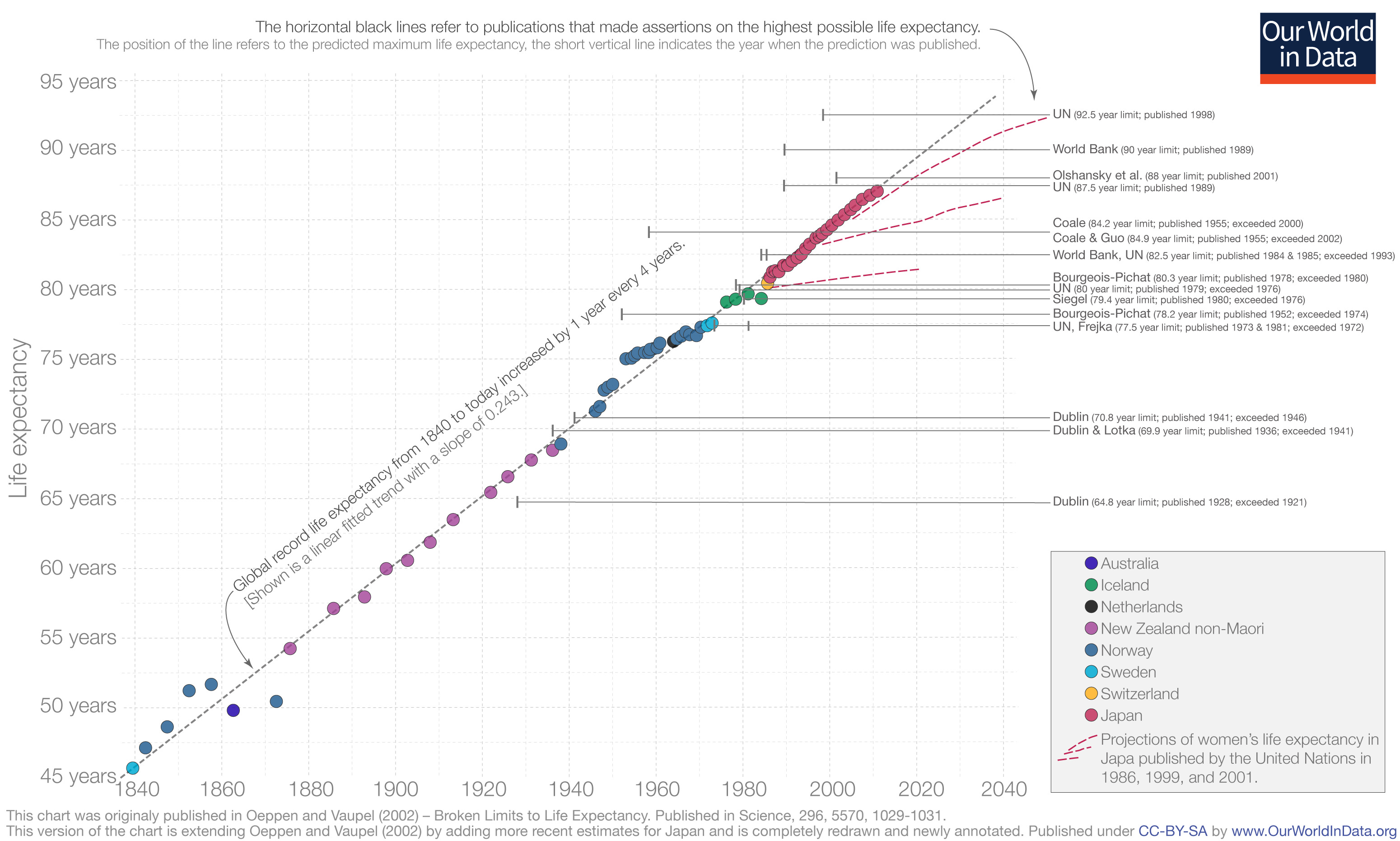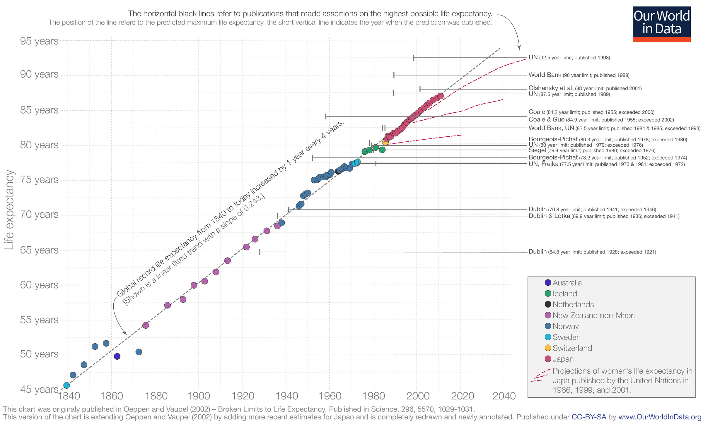 Experts have called the biological maximum multiple times since 1840. They've been wrong every time. Global record life expectancy has increased by 1 year every 4 years since 1840.