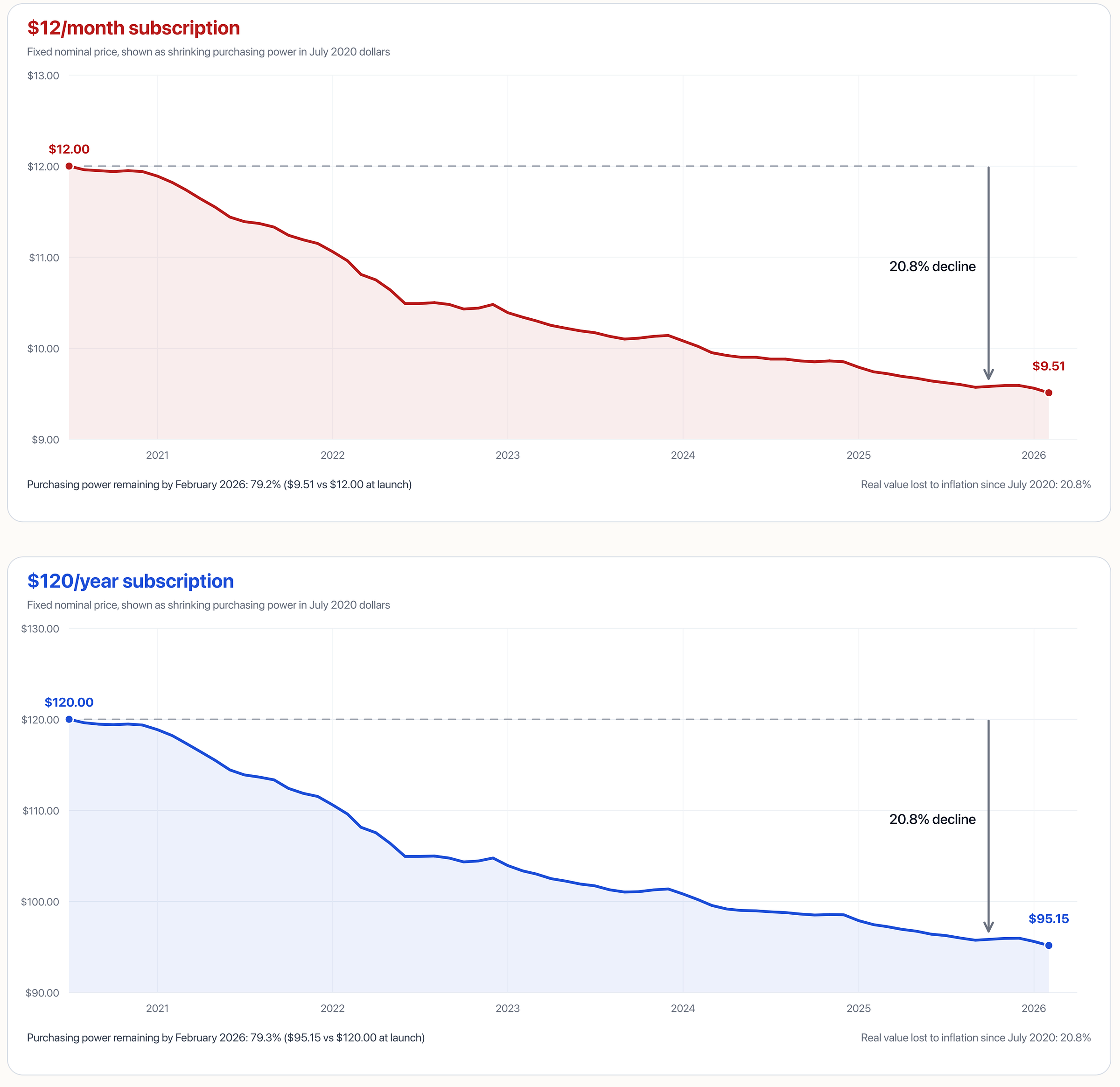 So after not touching it since 2020, I’ve decided to adjust subscription prices for the first time to catch up with inflation. According to official CPI, each dollar now only has 79.2% of the value it had then.