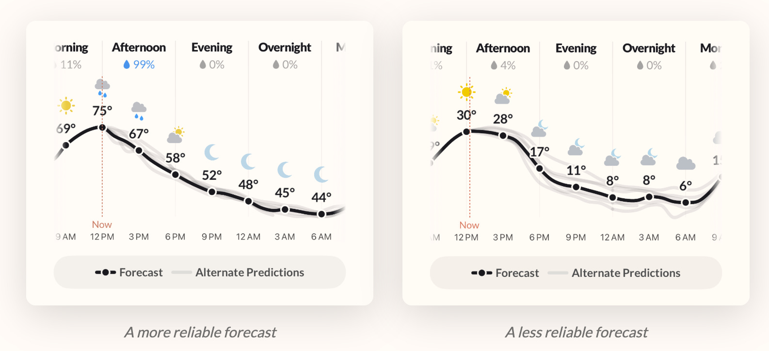 But I gotta admit that this new feature from Acme Weather, which is made by some of the people who made Dark Sky weather before it was acquired by Apple, is really cool. Their weather line makes the forecast uncertainly visual by showing the spread widen or tighten depending on various factors.
