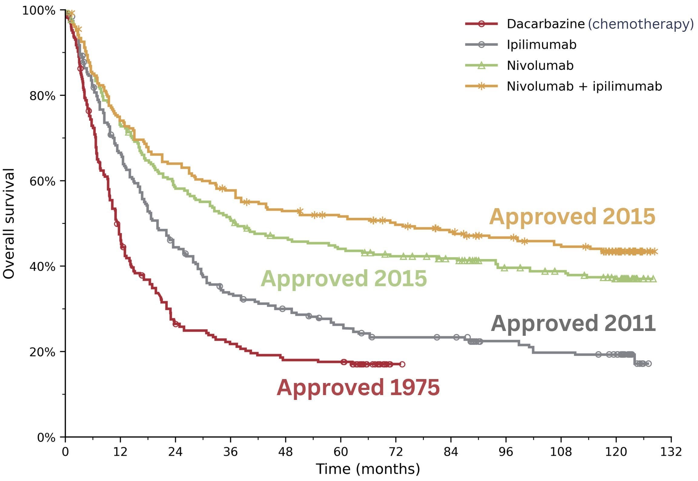A different cancer, a similar story: The improvement for Stage 4 melanoma (stage 4 means that it has spread to other parts of the body) is also dramatic: