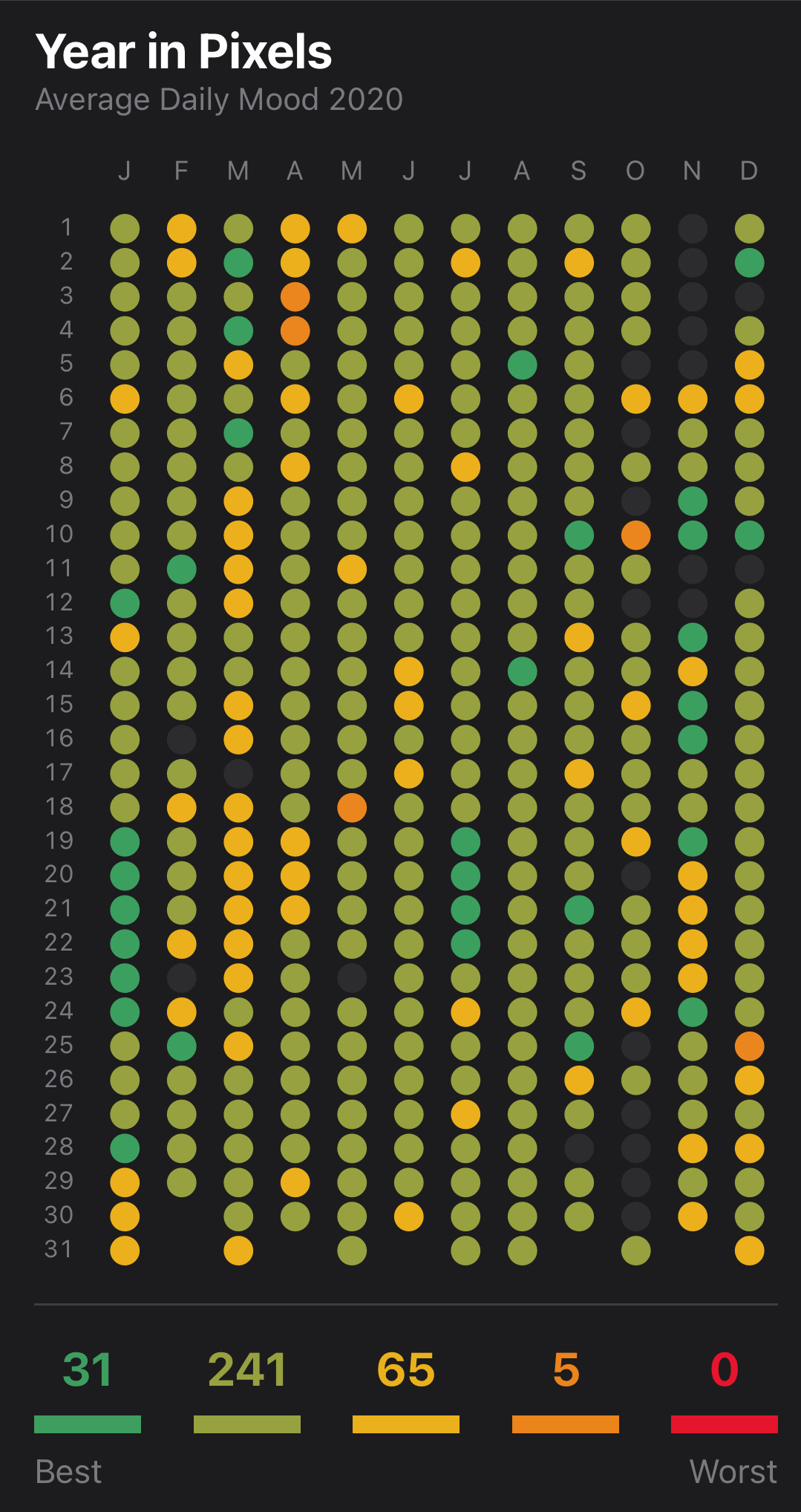 March was my worst month of the year (mix of pandemic + moving to a new house + market crash and general uncertainty). But even that was mostly just 3/5. I’ve only had 5 days that qualified as 2/5 for the year, and zero 1/5.
