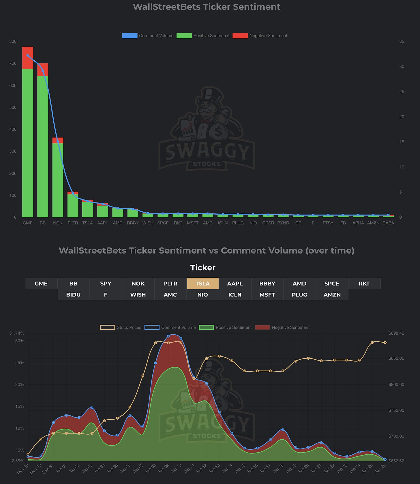 You know your little Reddit community is influential when people create visualization dashboard to track which stocks are mentioned on it and sentiment. You can see ticker sentiment here, and real-time overall sentiment here. What a world we live in.