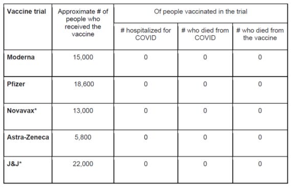 Since the beginning of the trials, all trials, there has not been a single death or hospitalization among people vaccinated. Not one. Zero. Not for Moderna, not for Pfizer/BioNTech, not for Oxford/AstraZeneca, not for Sputnik, not for J&J, not for Novavax.