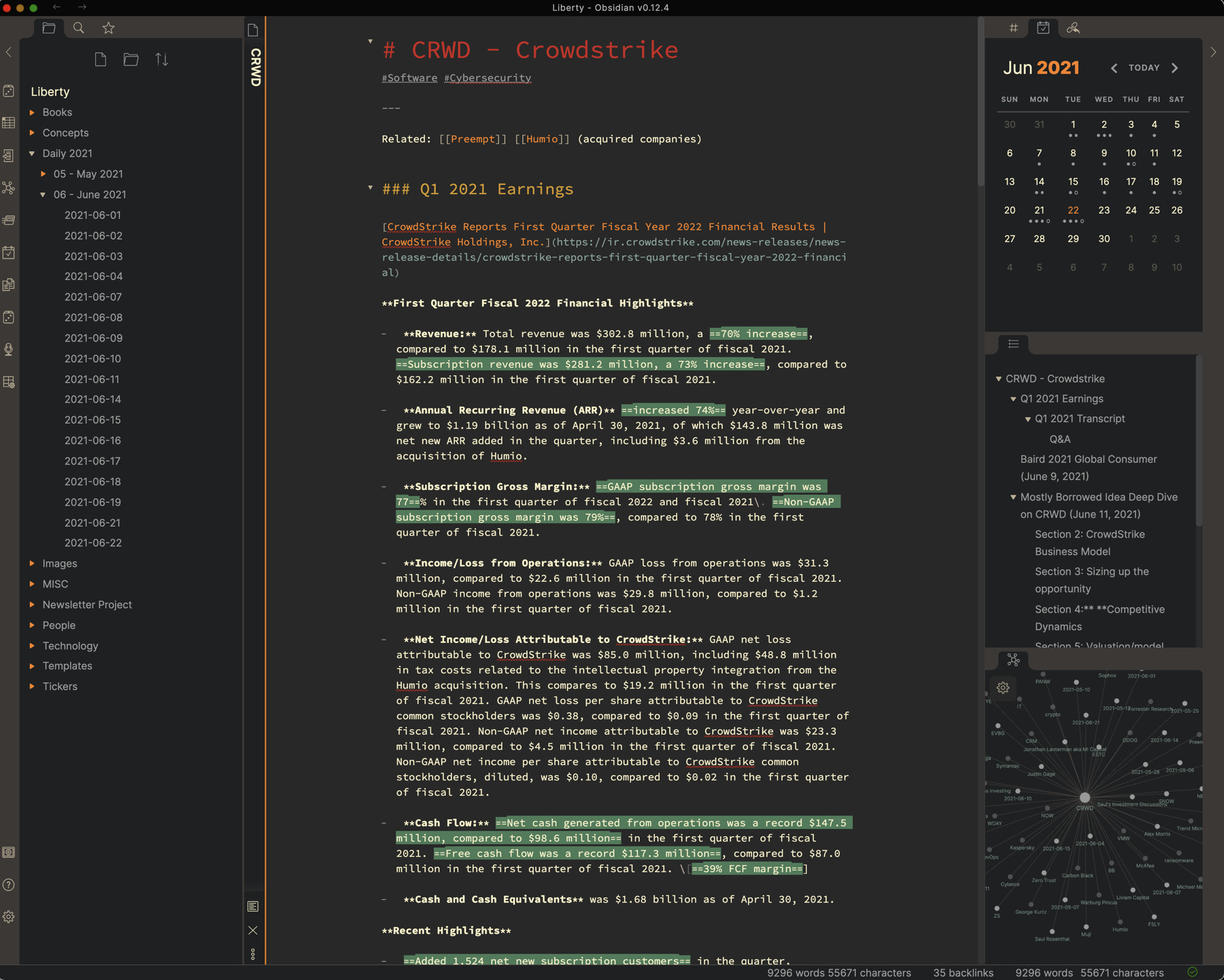 You can see the folder structure on the left, and on the right I have a calendar view (if I click on a day, it takes me to that day’s daily page), the page outline (you can click on a sub-title to jump to that part of the document), and a mini-graph view that shows what this page links to.